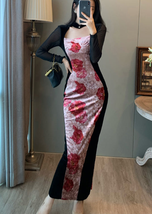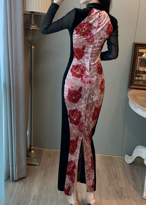 New Retro Pink Print Patchwork Silk Velvet Vacation Dresses Fall