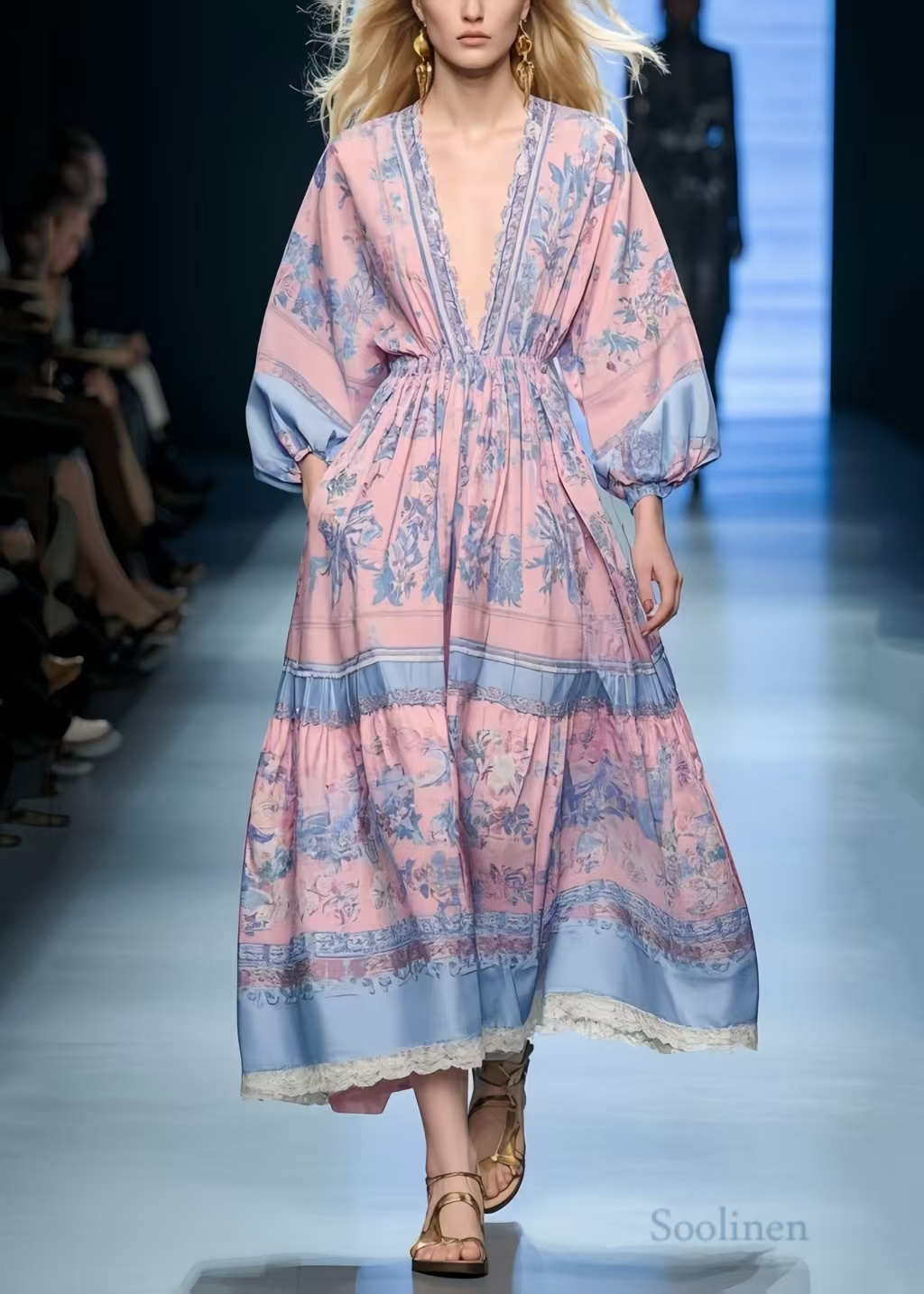 Natural Pink V Neck Print Lace Up Cotton Mini Dress Spring