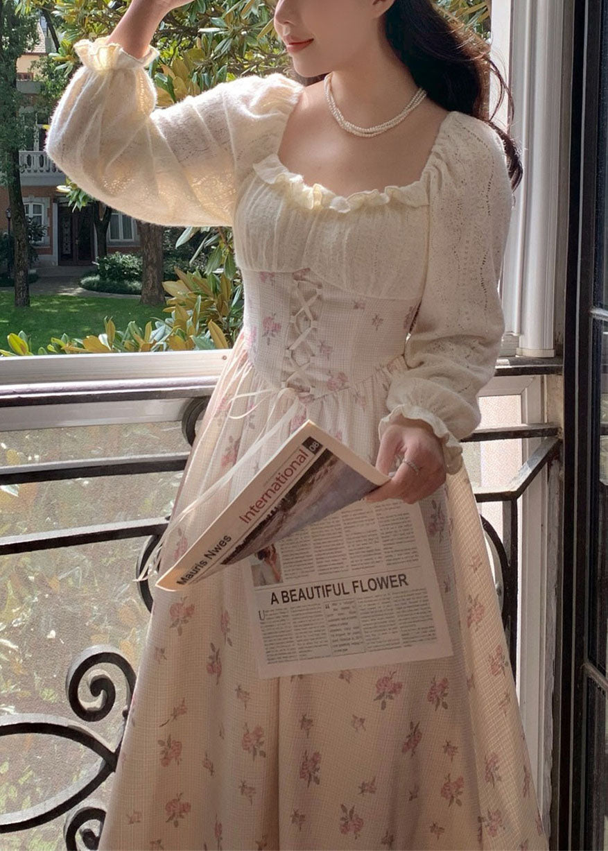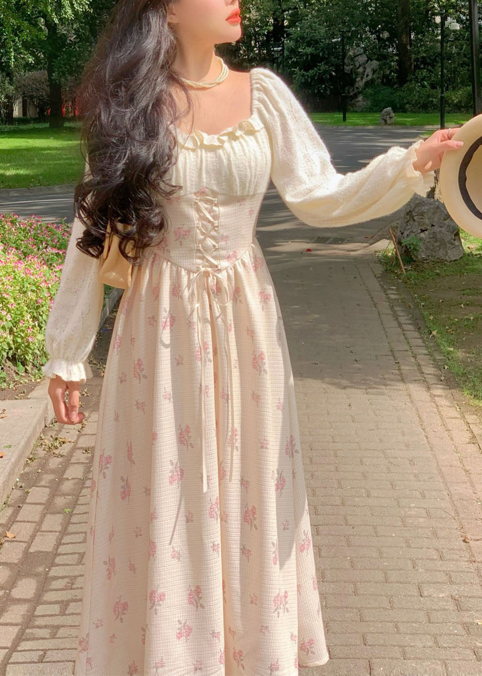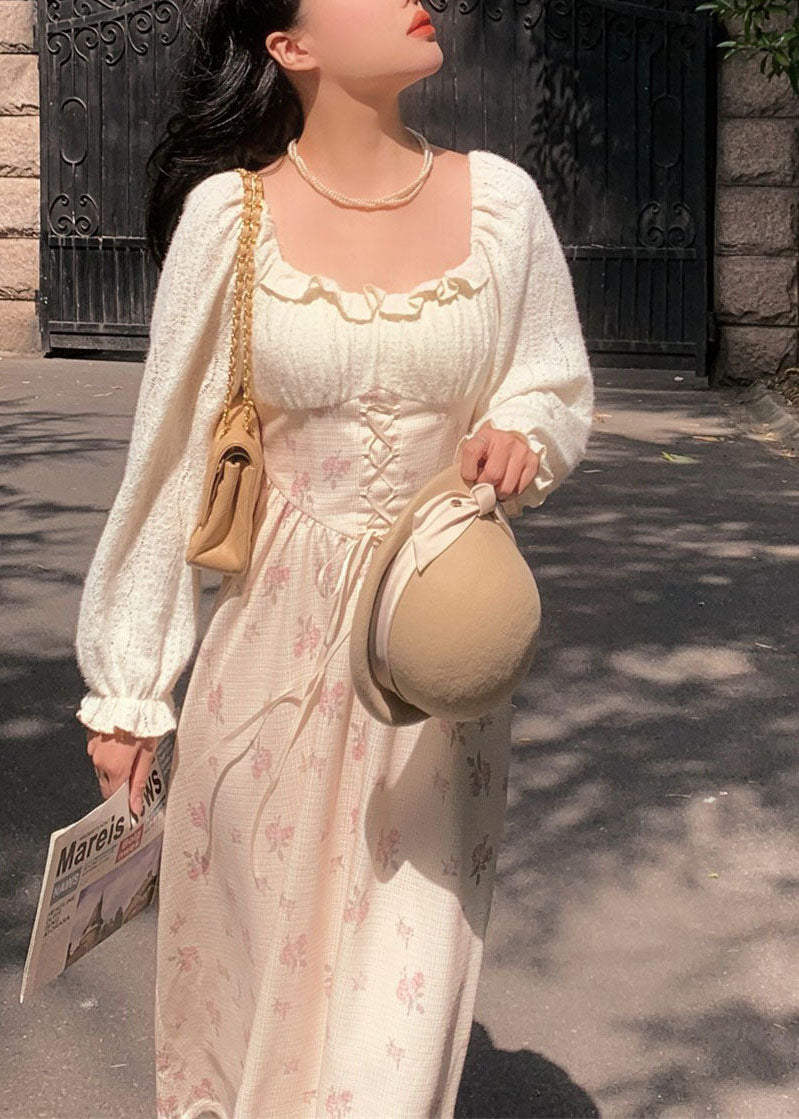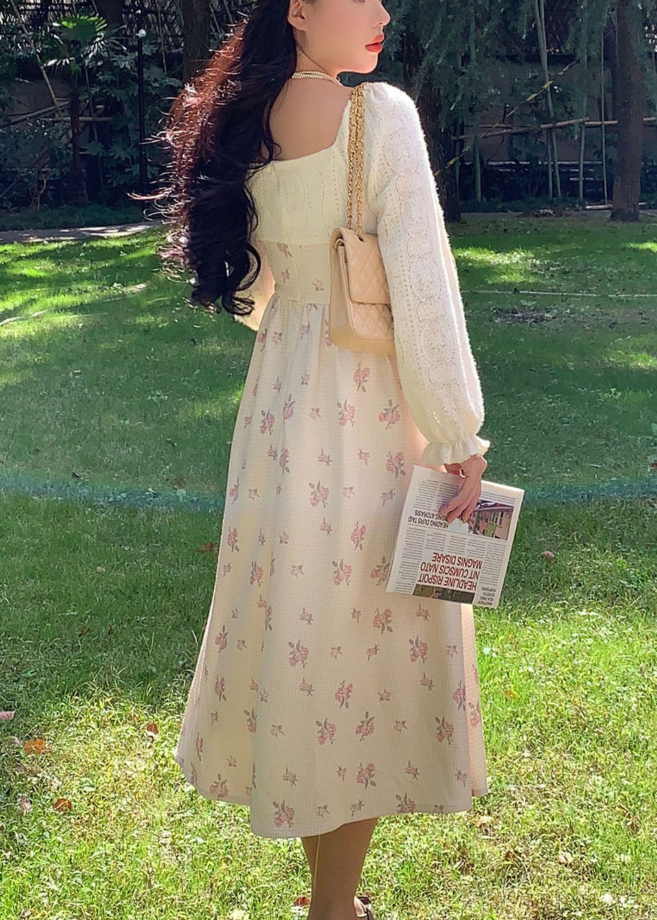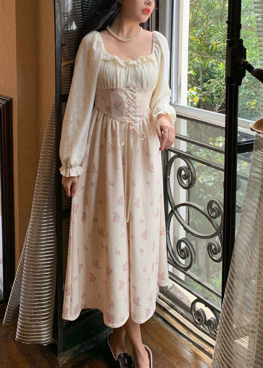 Fitted Pink Square Collar Patchwork Print Cotton Holiday Dress Spring