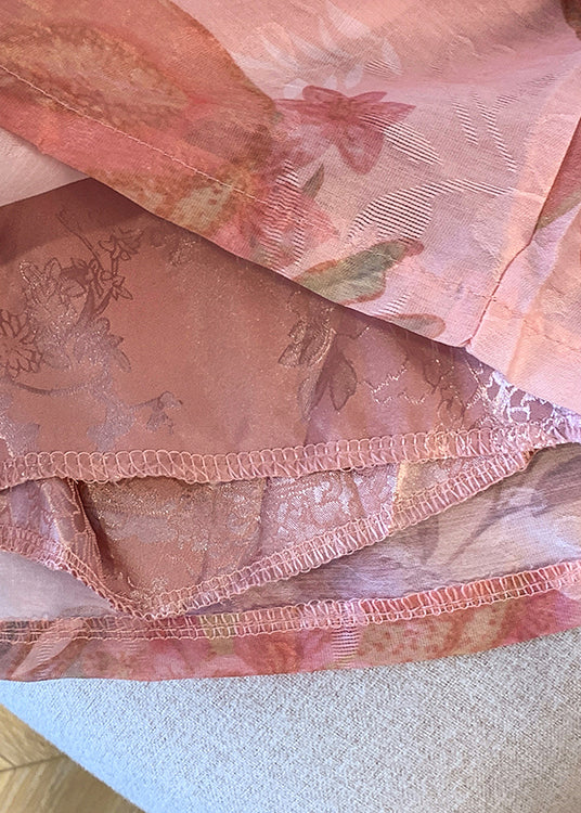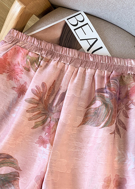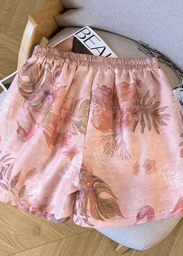 Beautiful Pink Elastic Waist Print Silk Shorts Summer