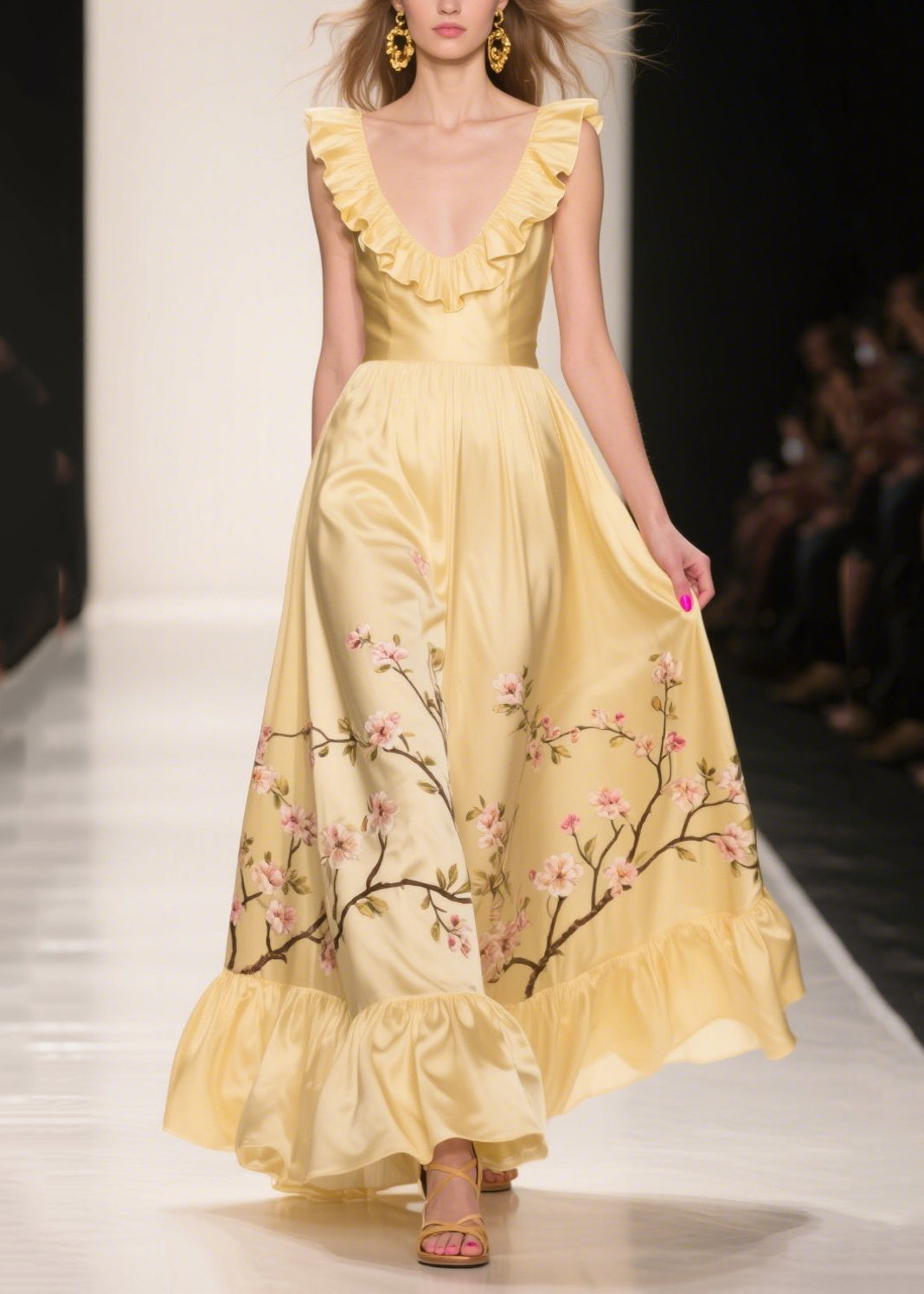 Casual Yellow Ruffles Print Silk Vestidos Dress Summer