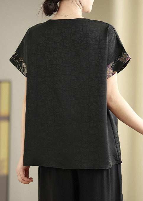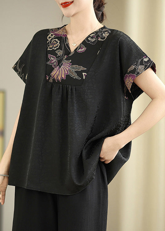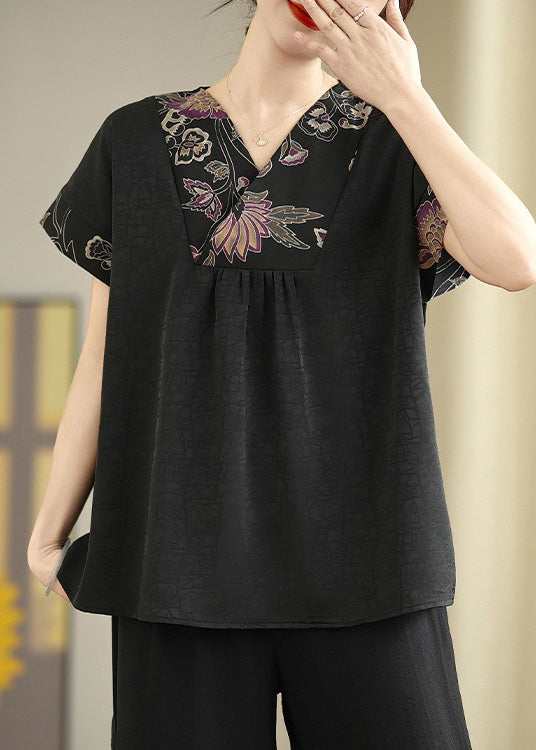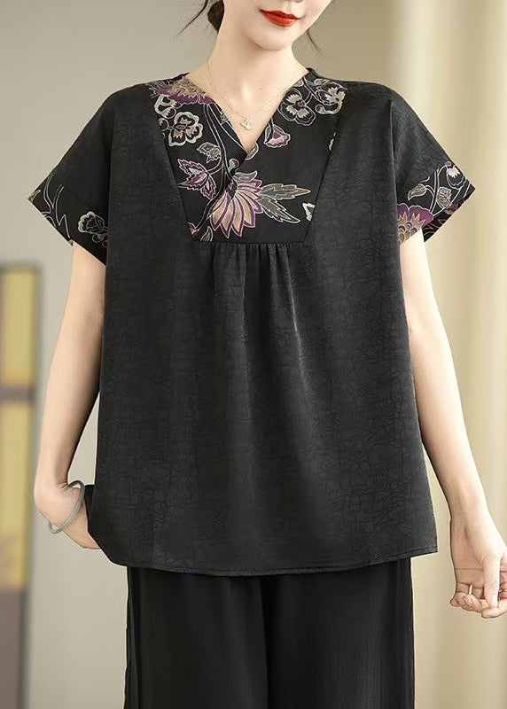 Elegant Black V Neck Patchwork Silk Shirt Tops Summer