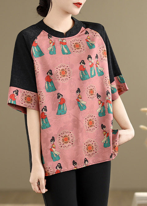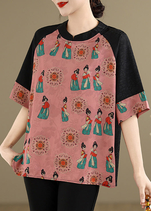 Fine Pink Mandarin Collar Print Silk Shirt Summer