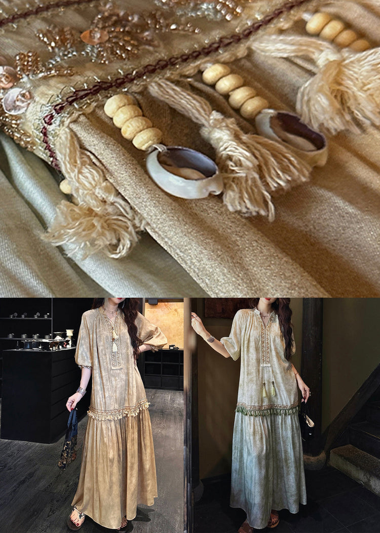 Loose Green Tasseled Silk Long Dresses Butterfly Sleeve