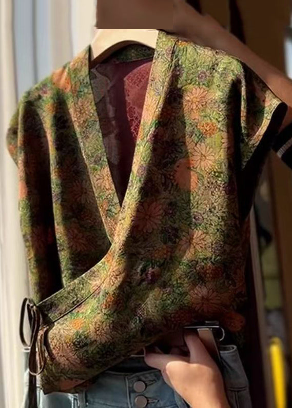 New Blue V Neck Print Lace Up Silk Shirt Summer