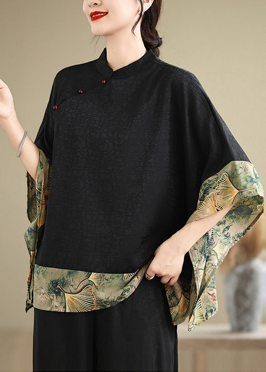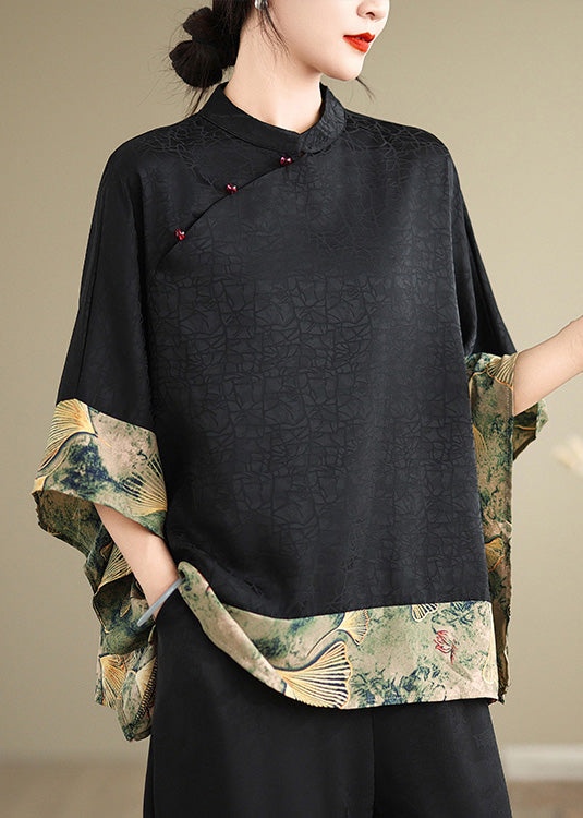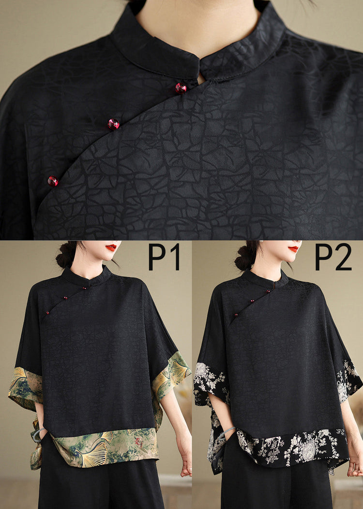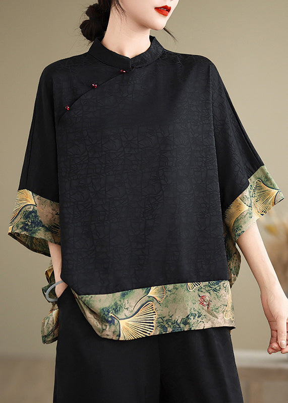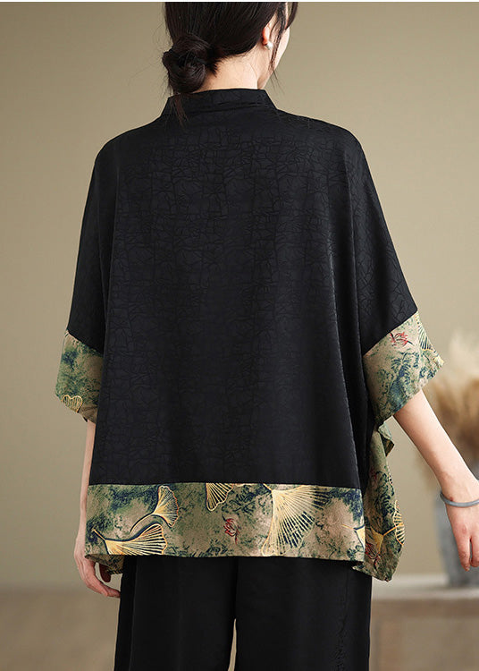 New Retro Khaki Print Patchwork Silk Shirt Tops Half Sleeve