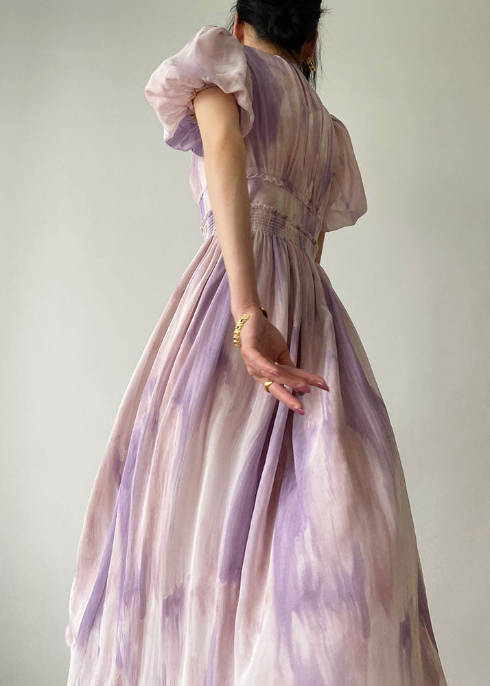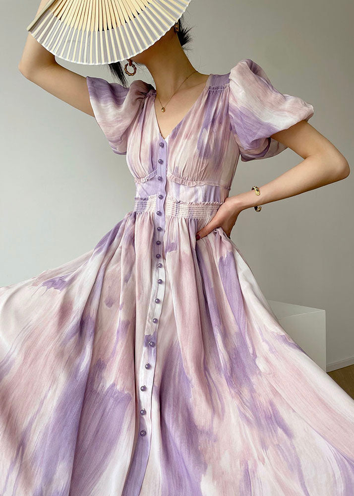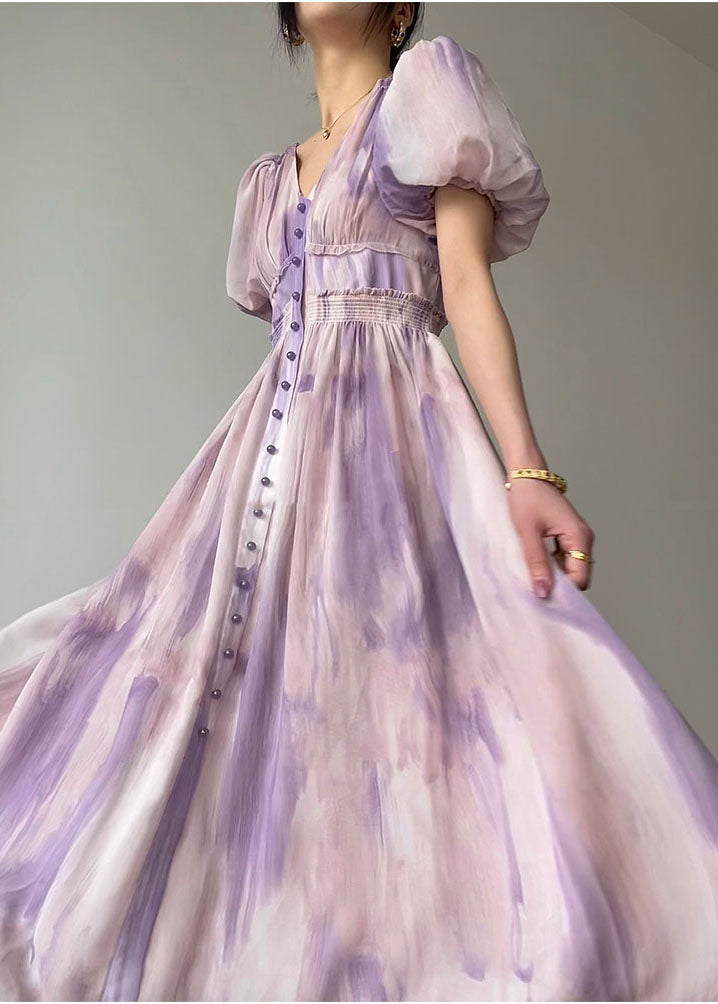 Purple Print Silk Holiday Cinch Dress V Neck Exra Large Hem Short Sleeve