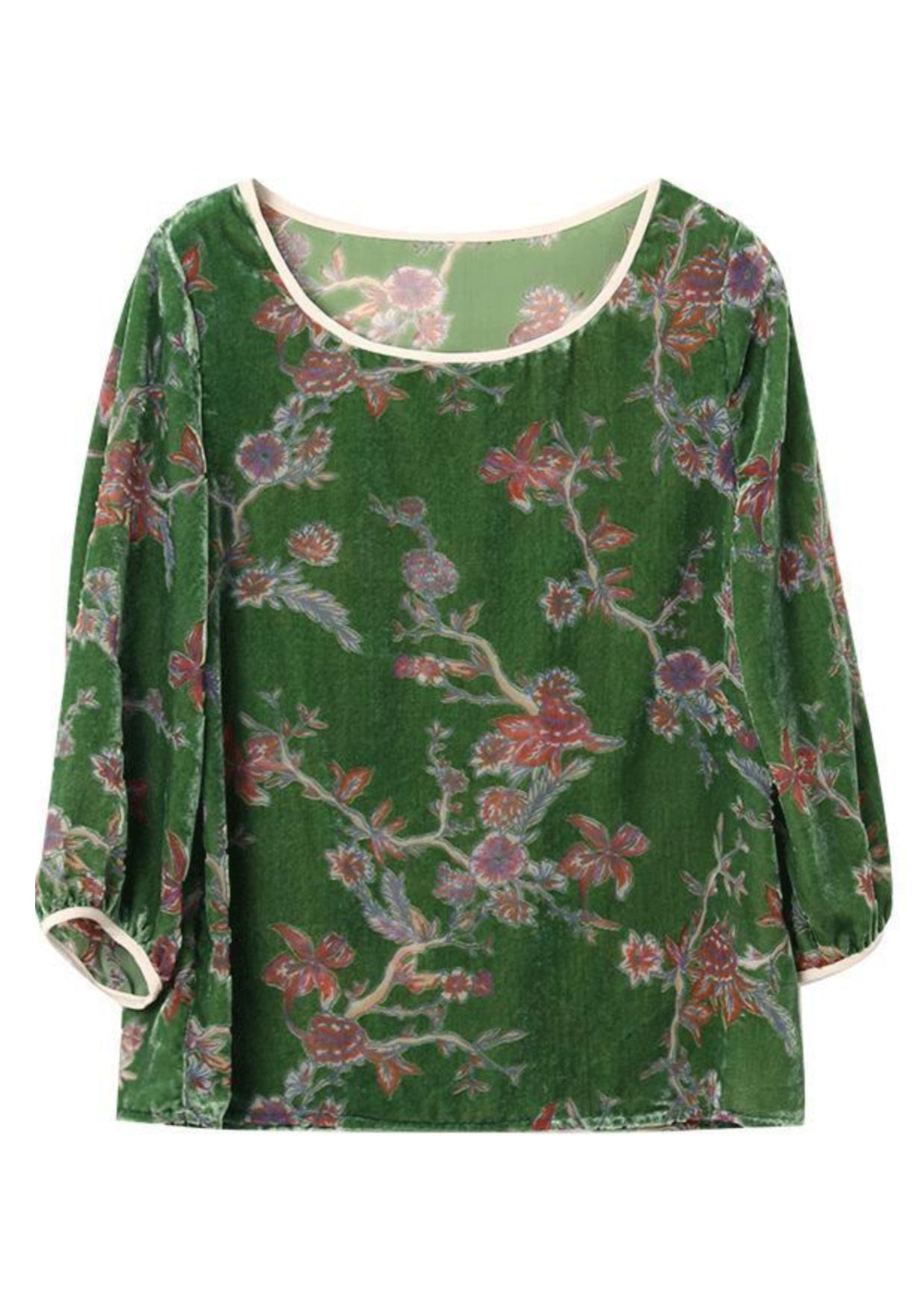 Vogue Green O-Neck Floral Silk Velour Shirt Flare Sleeve