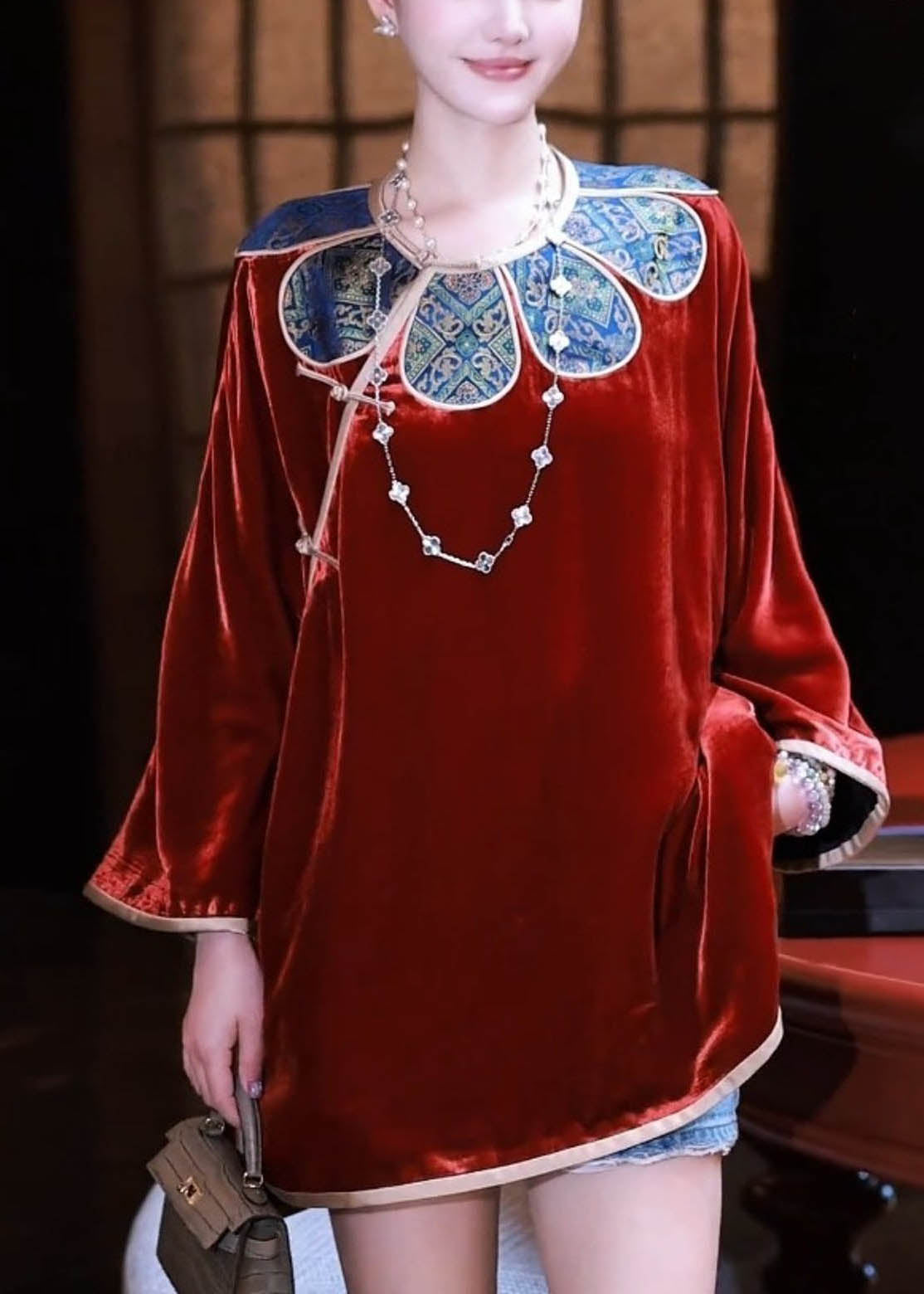 Elegant Mulberry O-Neck Button Silk Velour Shirt Fall