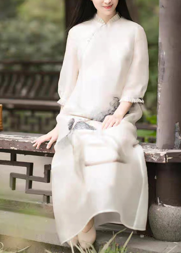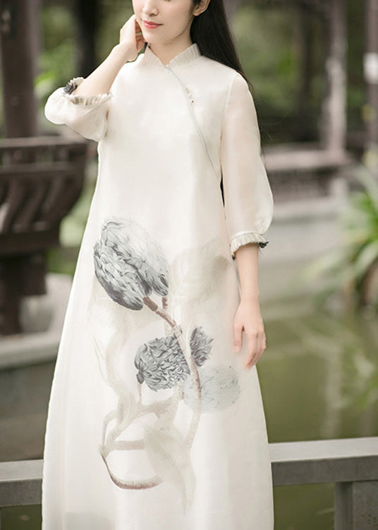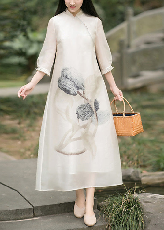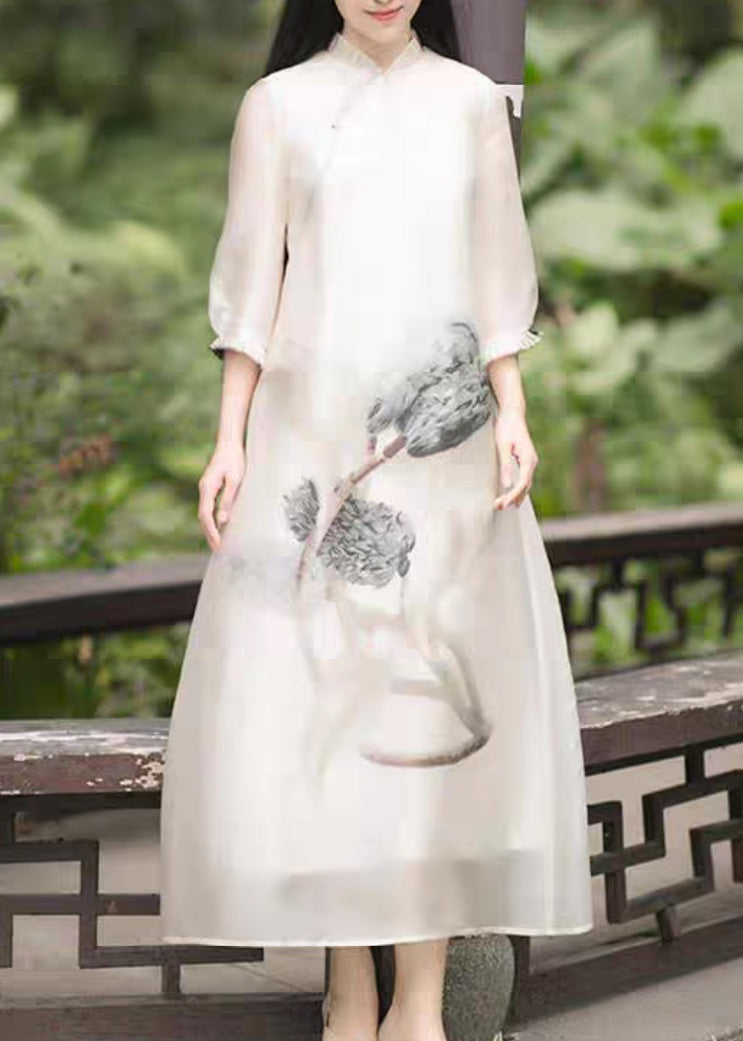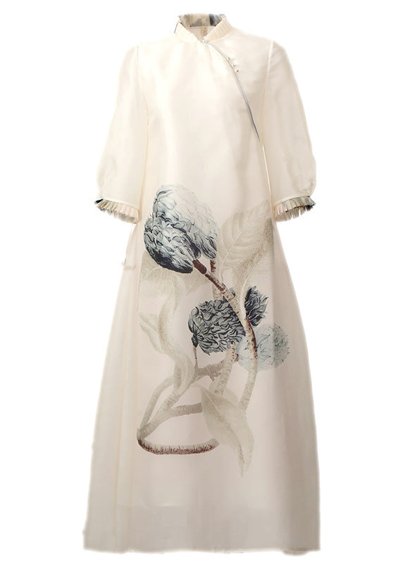 Brief Beige Stand Collar Print Button Silk Maxi Dress Spring