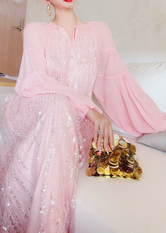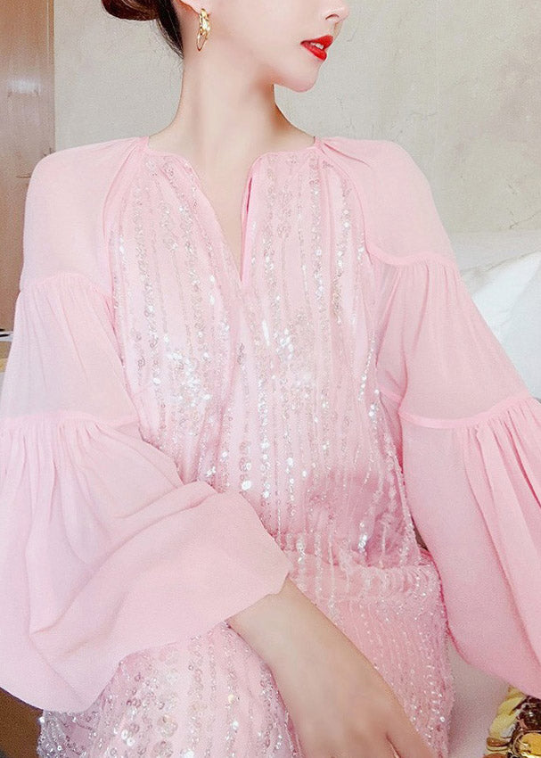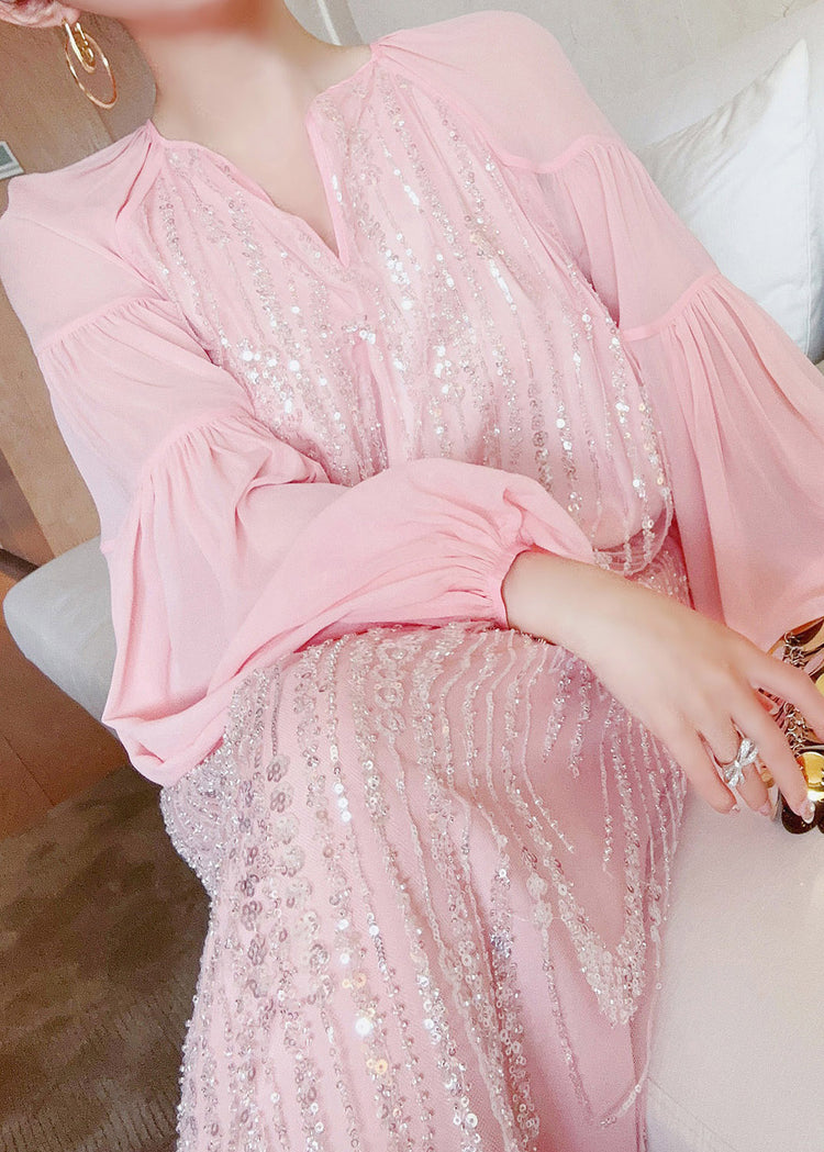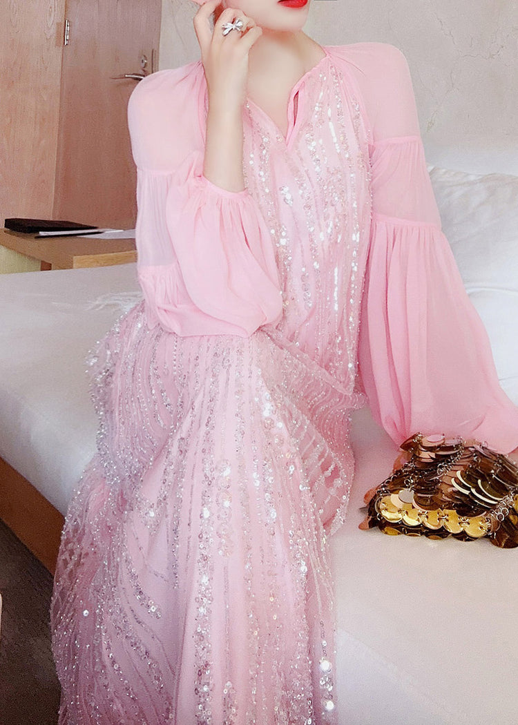 Cute Pink V Neck Patchwork Sequins Silk Long Dress Lantern Sleeve
