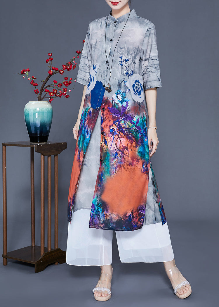 Diy Grey Stand Collar Oversized Tie Dye Silk Two Piece Set Women Clothing Summer