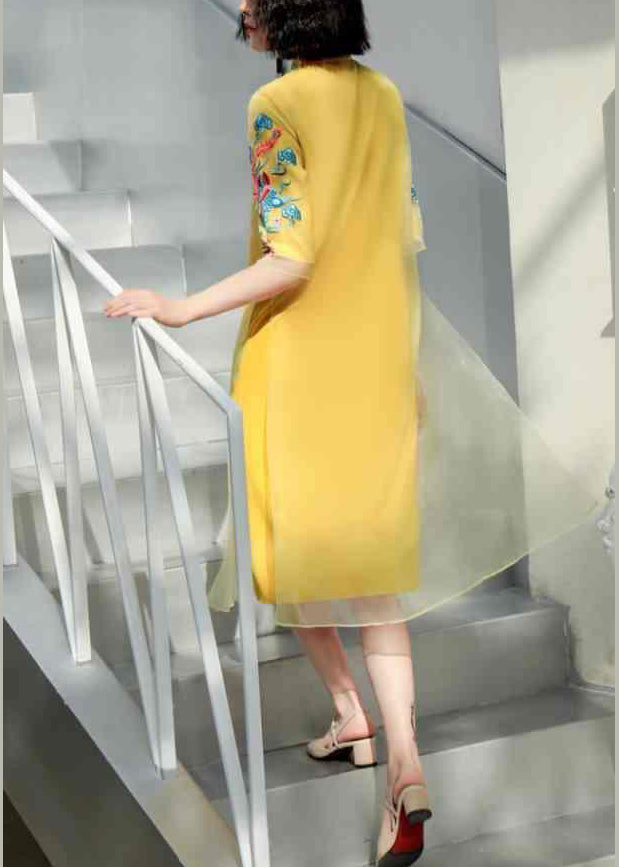 DIY Yellow Stand Collar Embroidered Button Tulle Silk Dress Long Sleeve