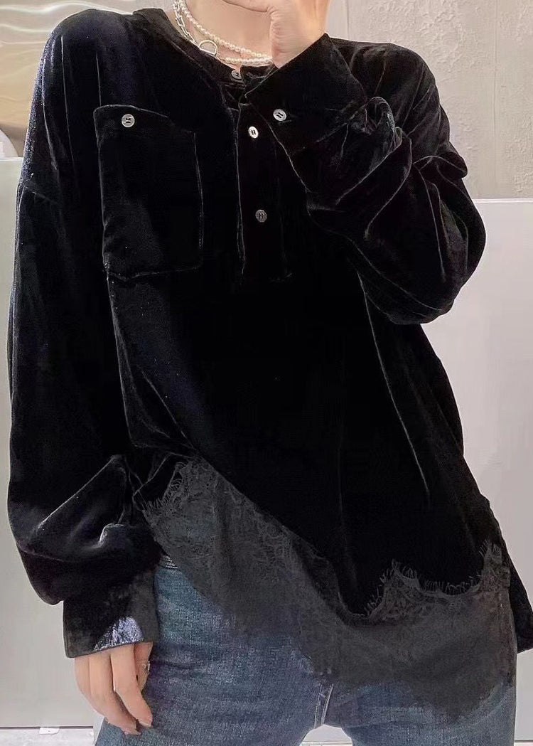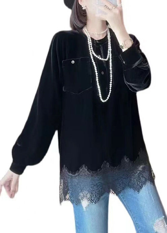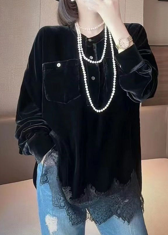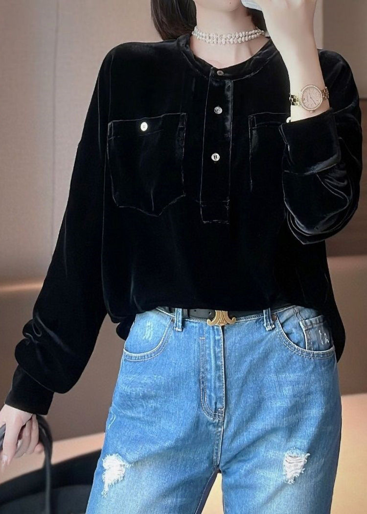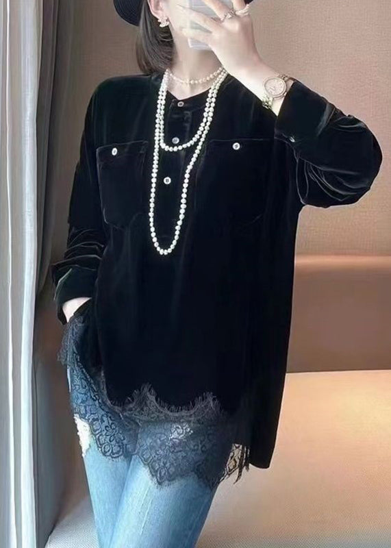 Elegant Black O Neck Button Patchwork Silk Velour Tops Fall