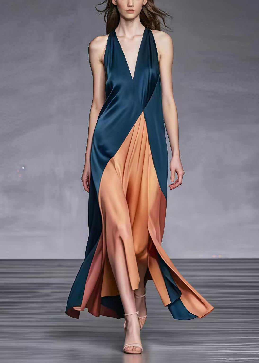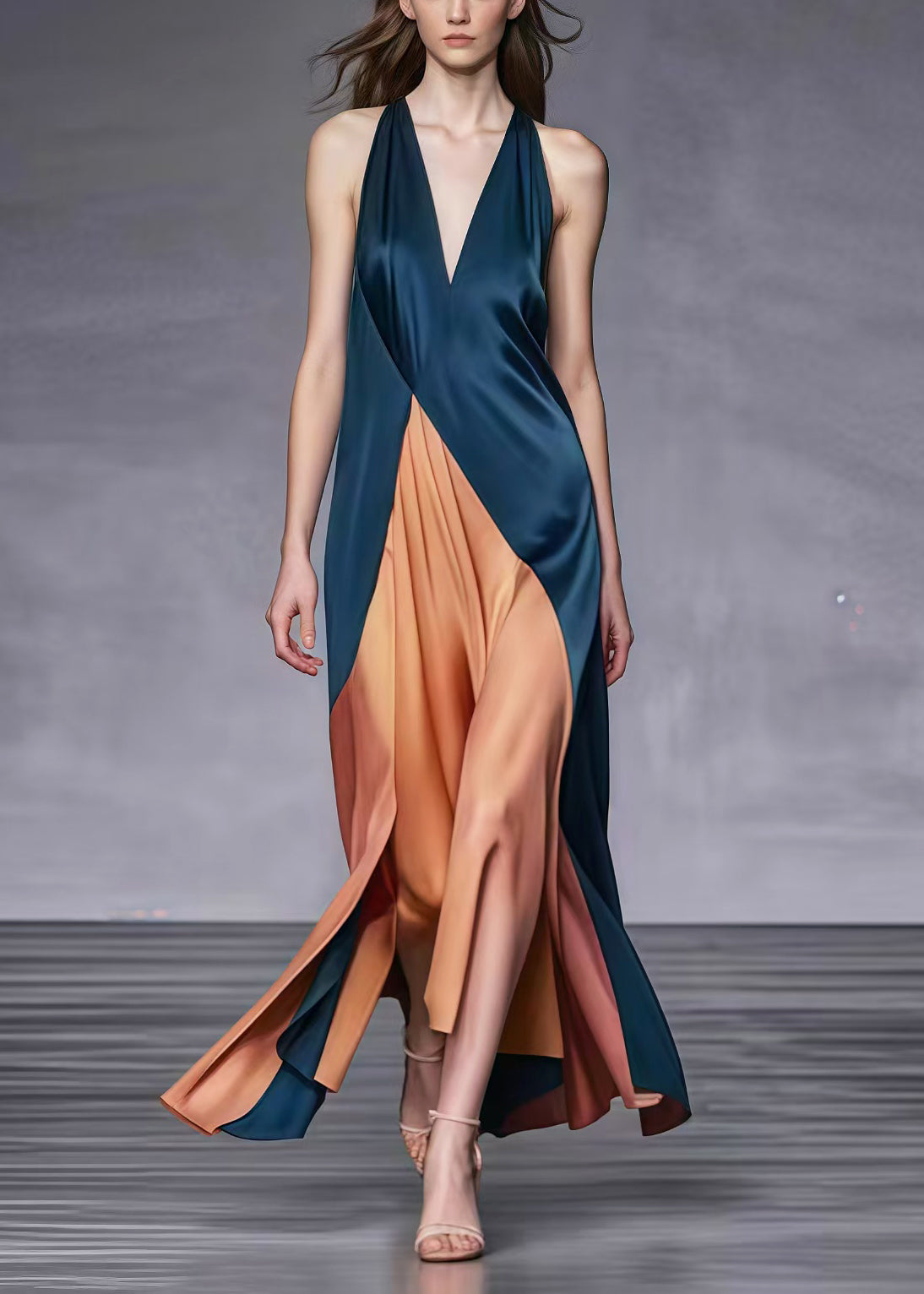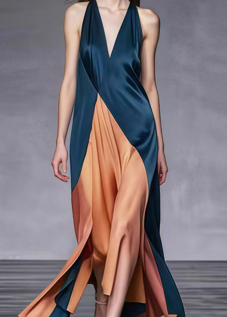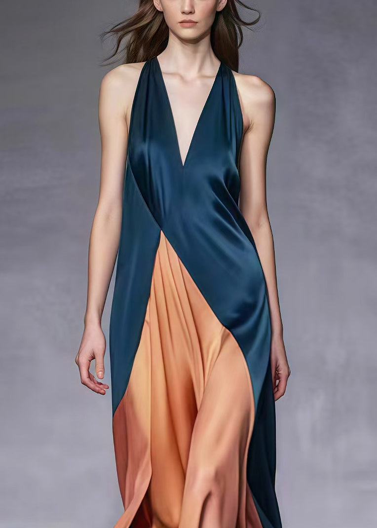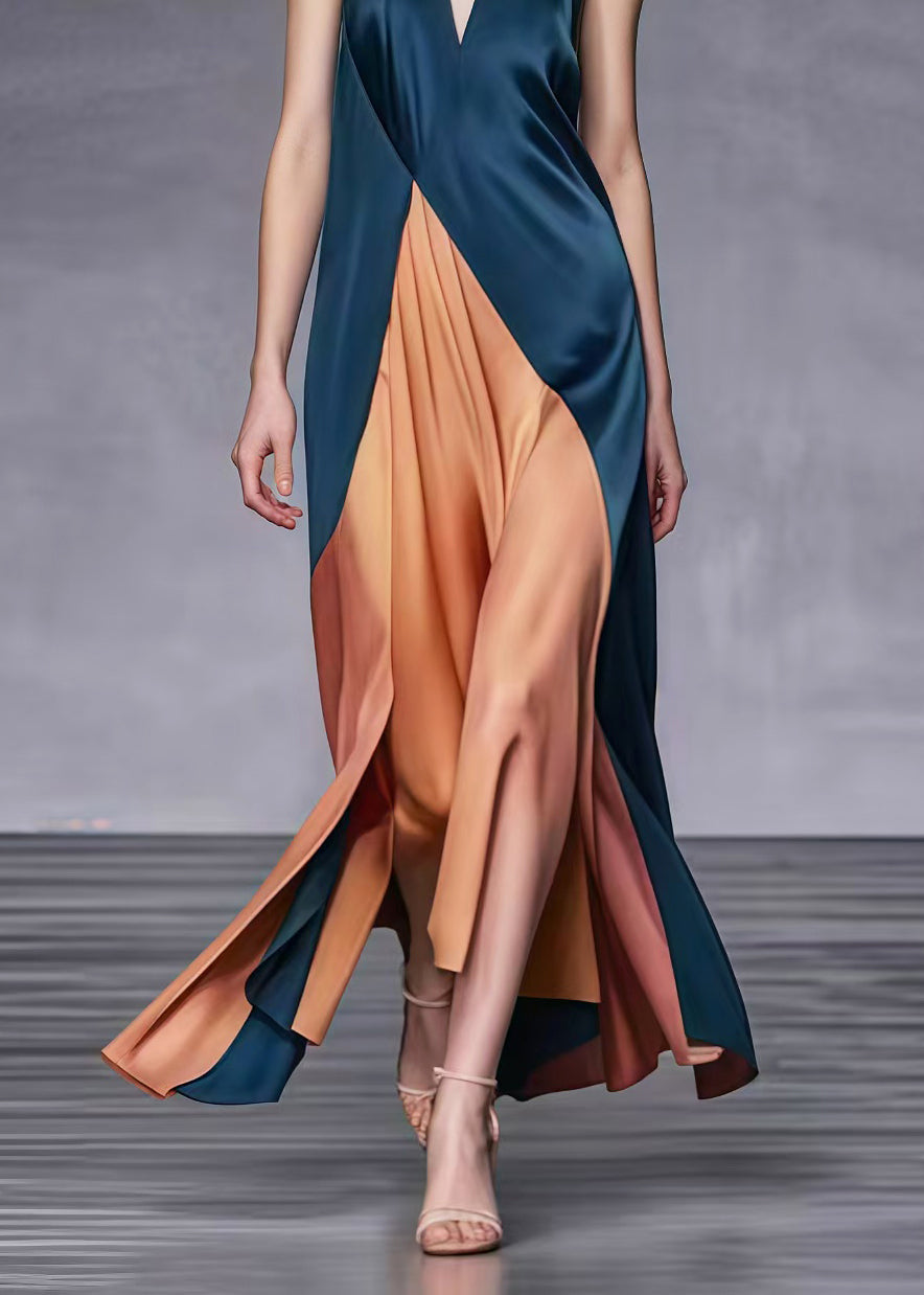 Elegant Blackish Green V Neck Patchwork Silk Ankle Dress Summer