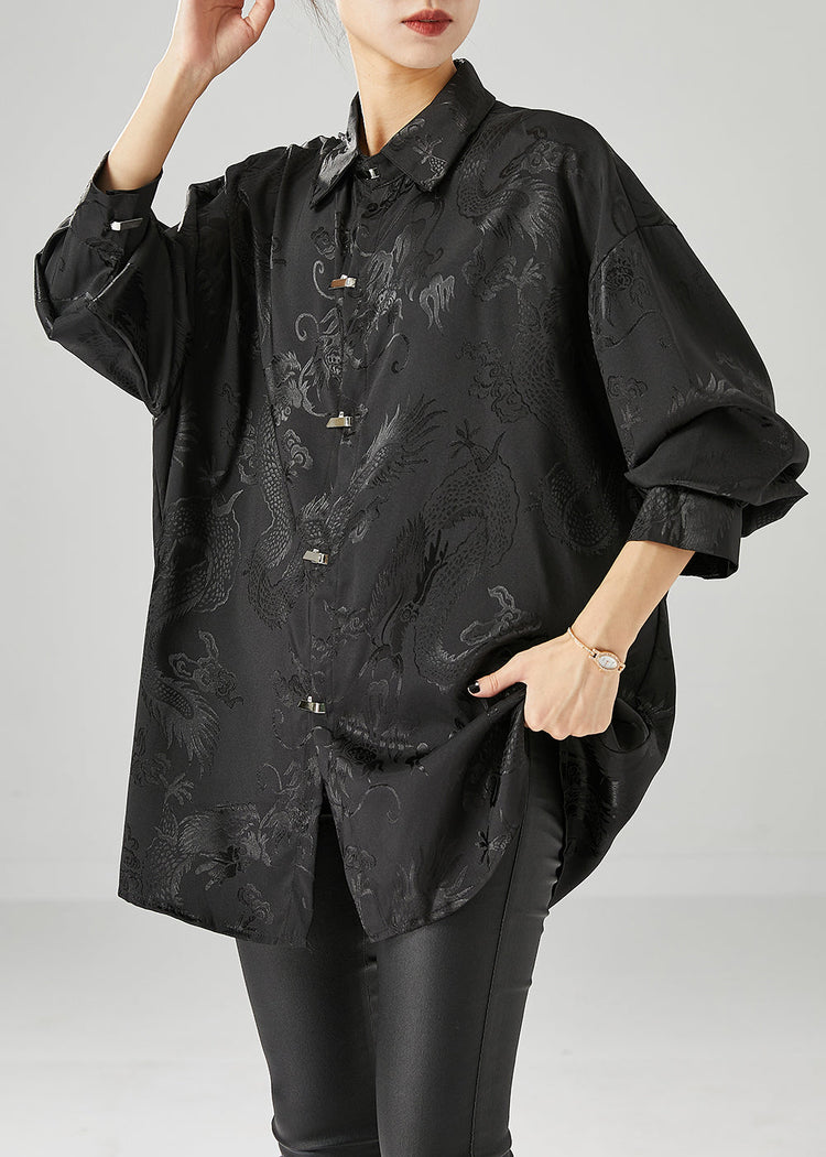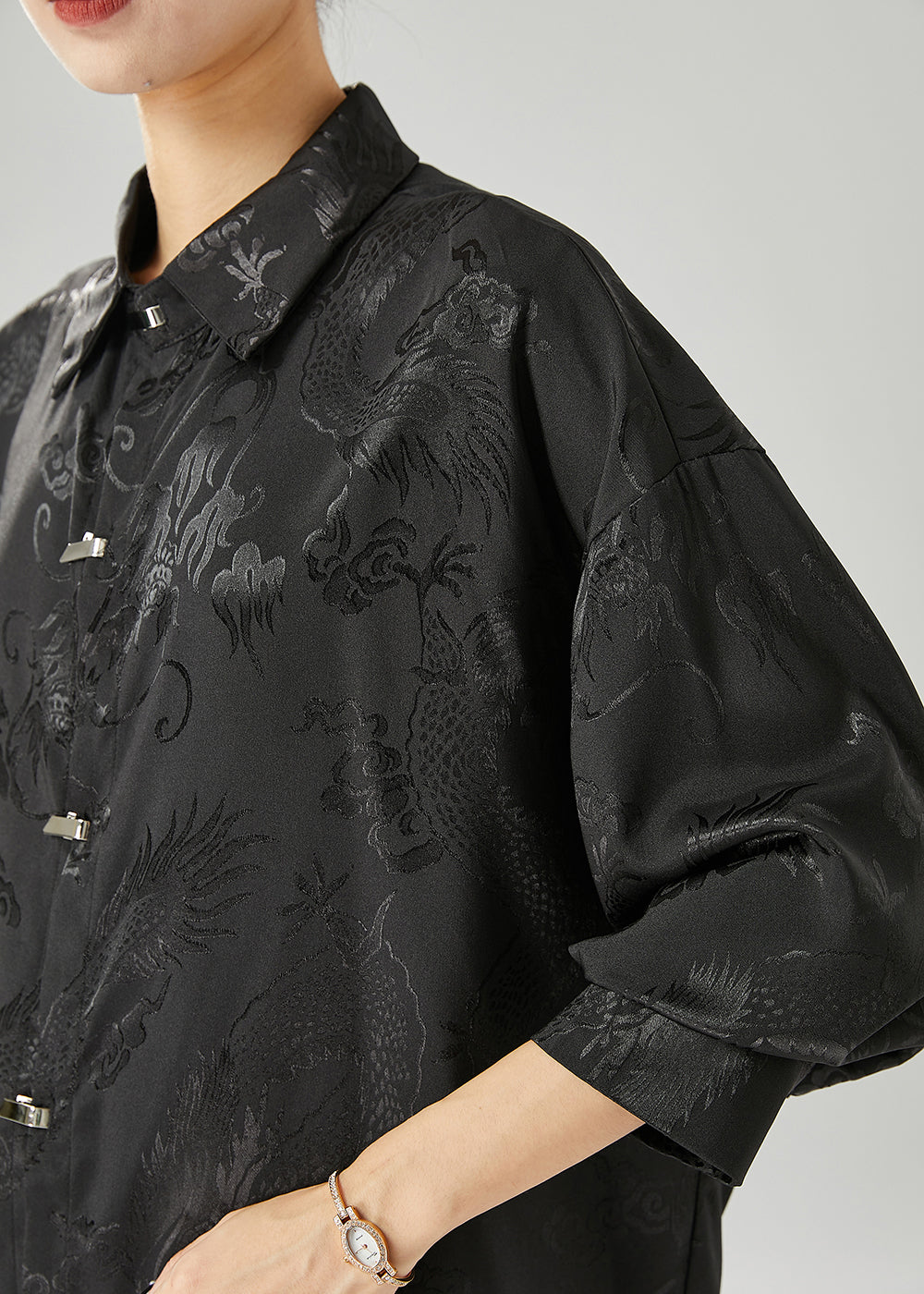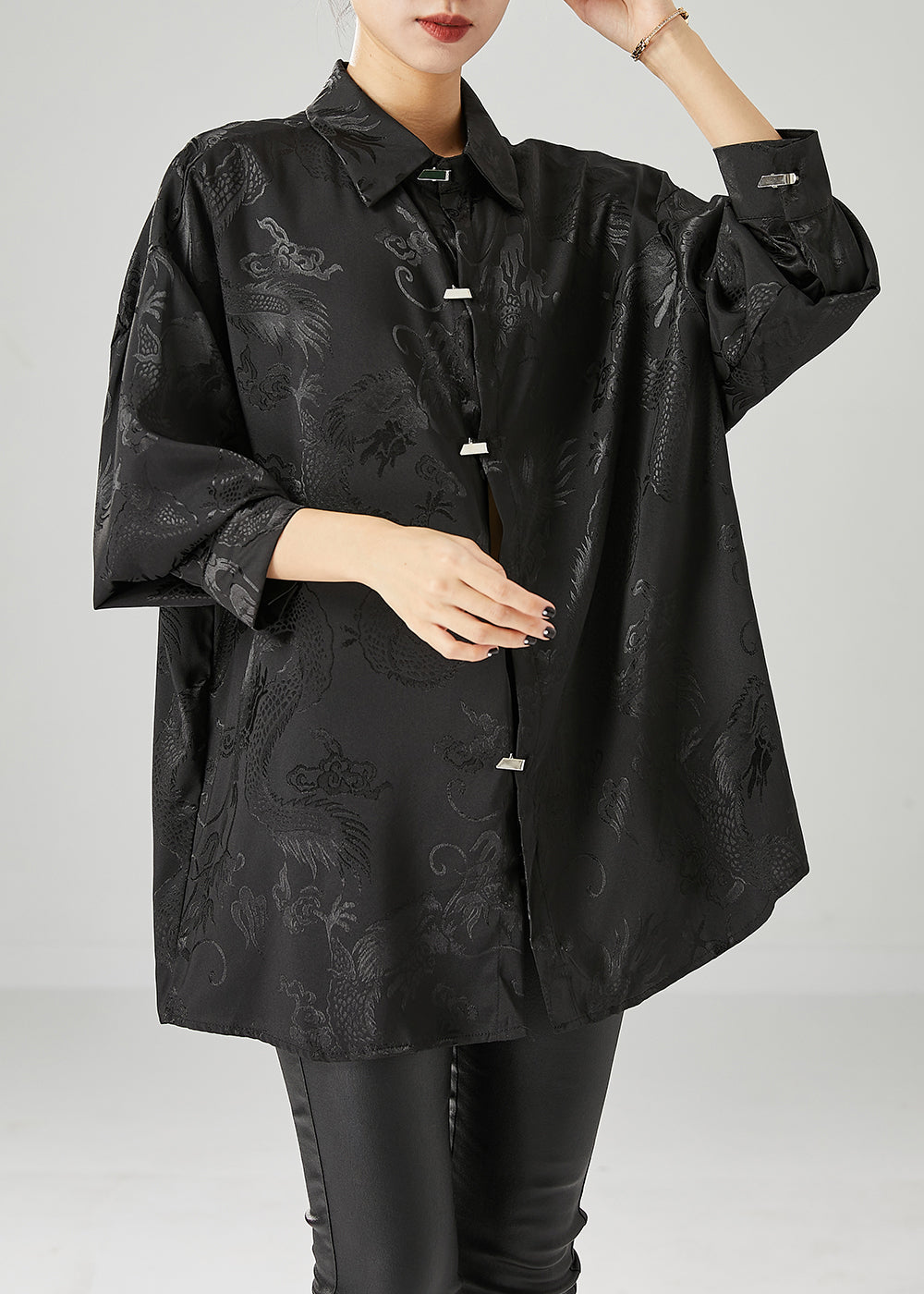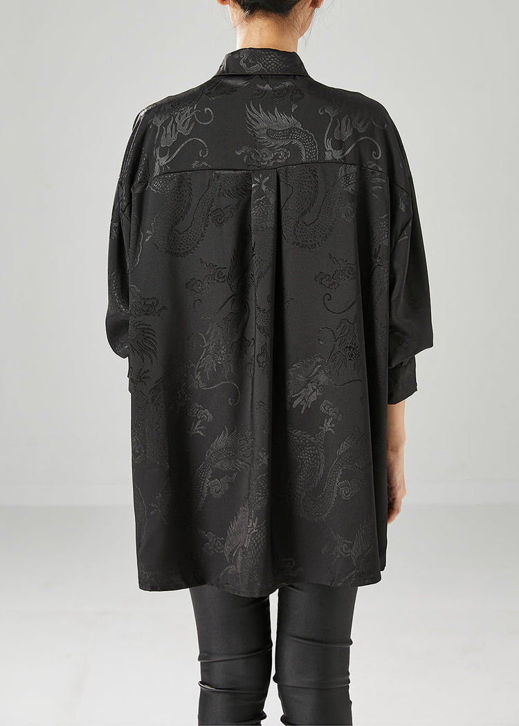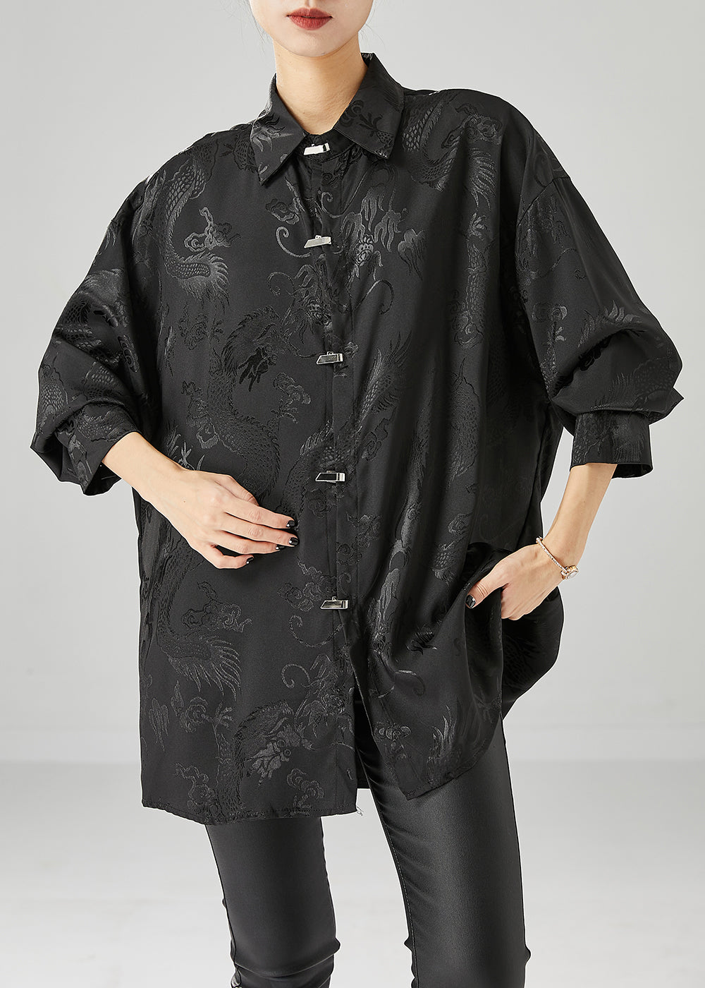 Fine Black Oversized Jacquard Silk Blouse Tops Fall