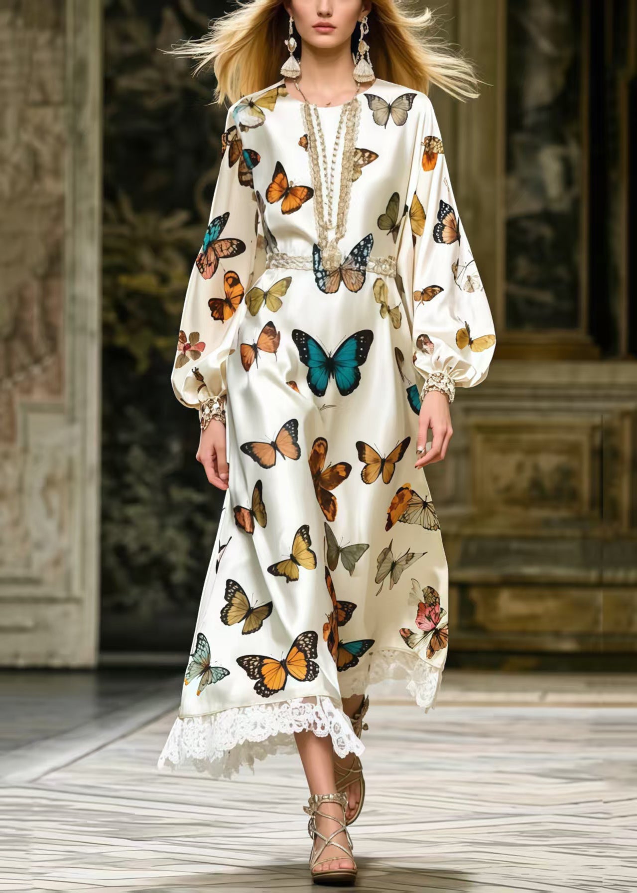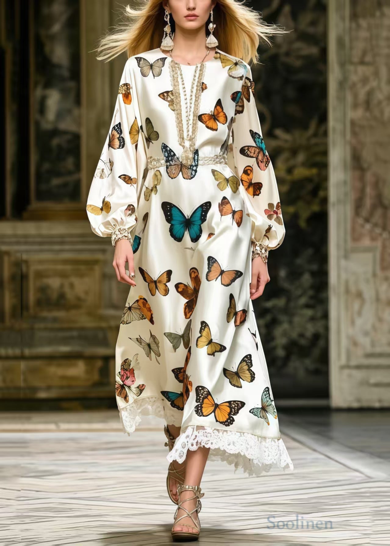 Fine Polychrome Butterfly Lace Patchwork Silk Party Dress Spring
