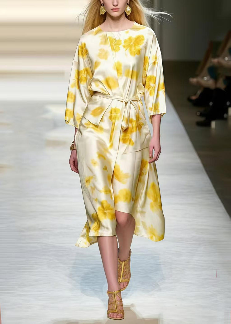 French Apricot Asymmetrical Print Silk Work Dresses Spring