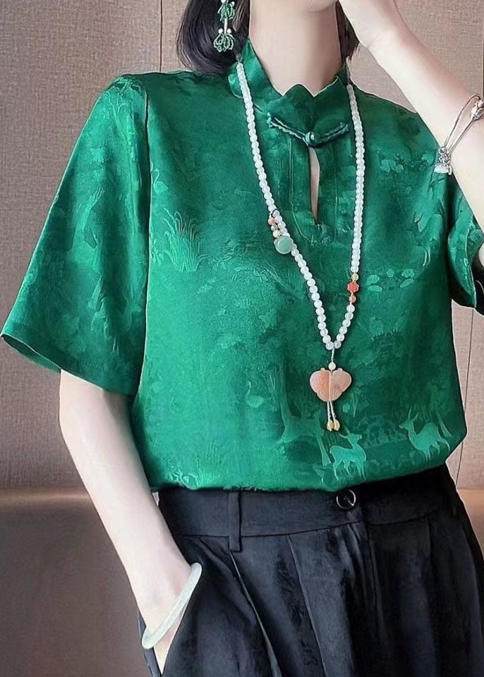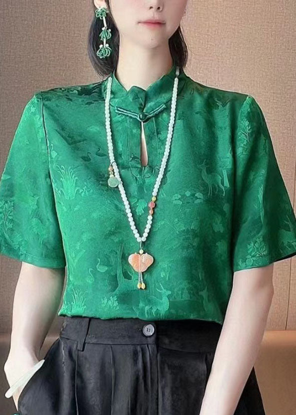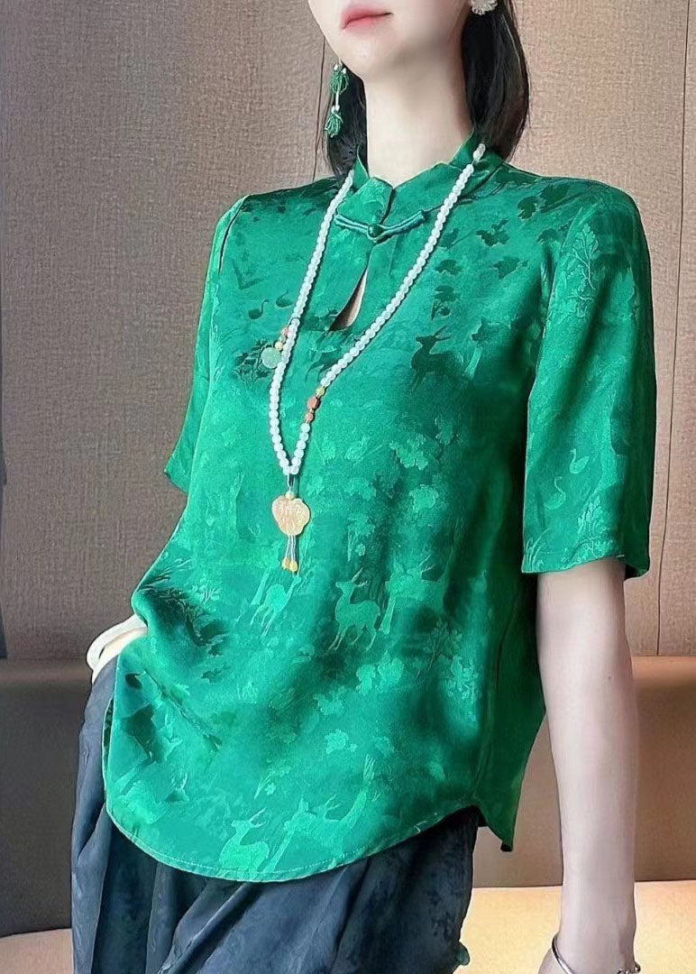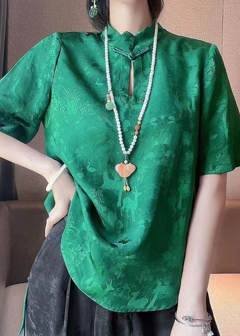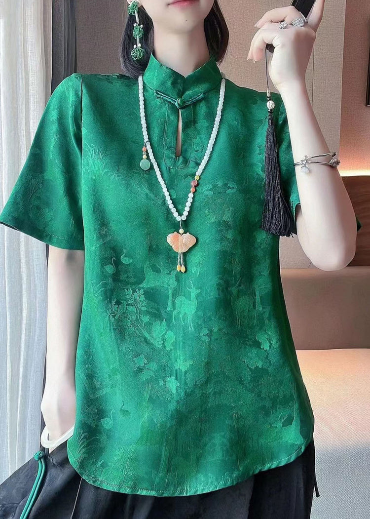 Handmade Green Mandarin Collar Print Oriental Button Silk Blouses Short Sleeve