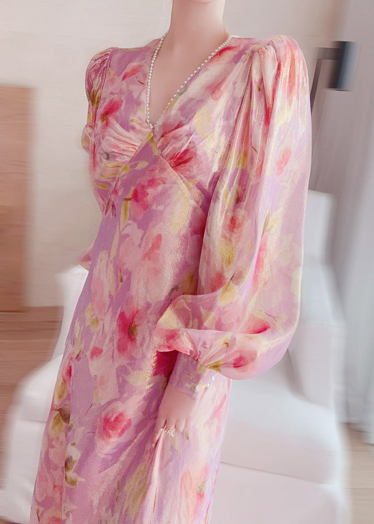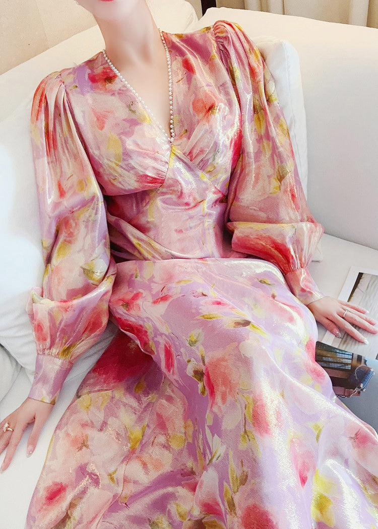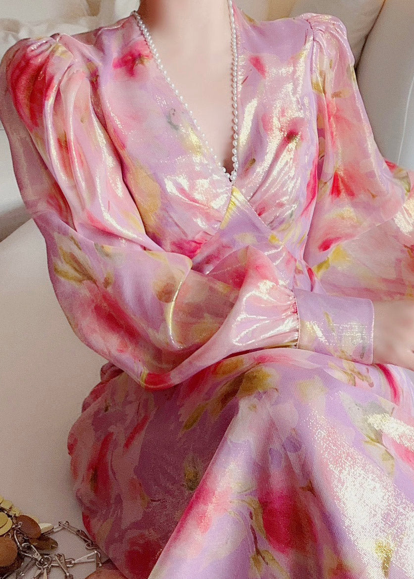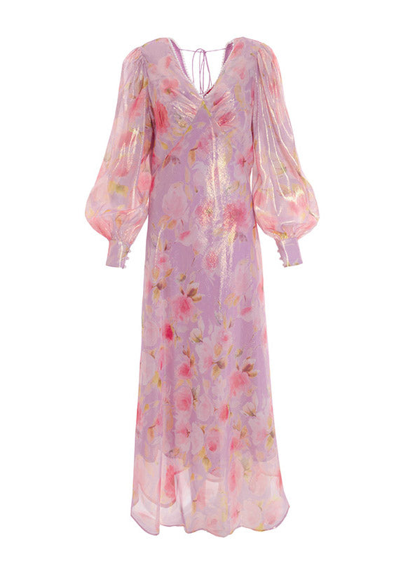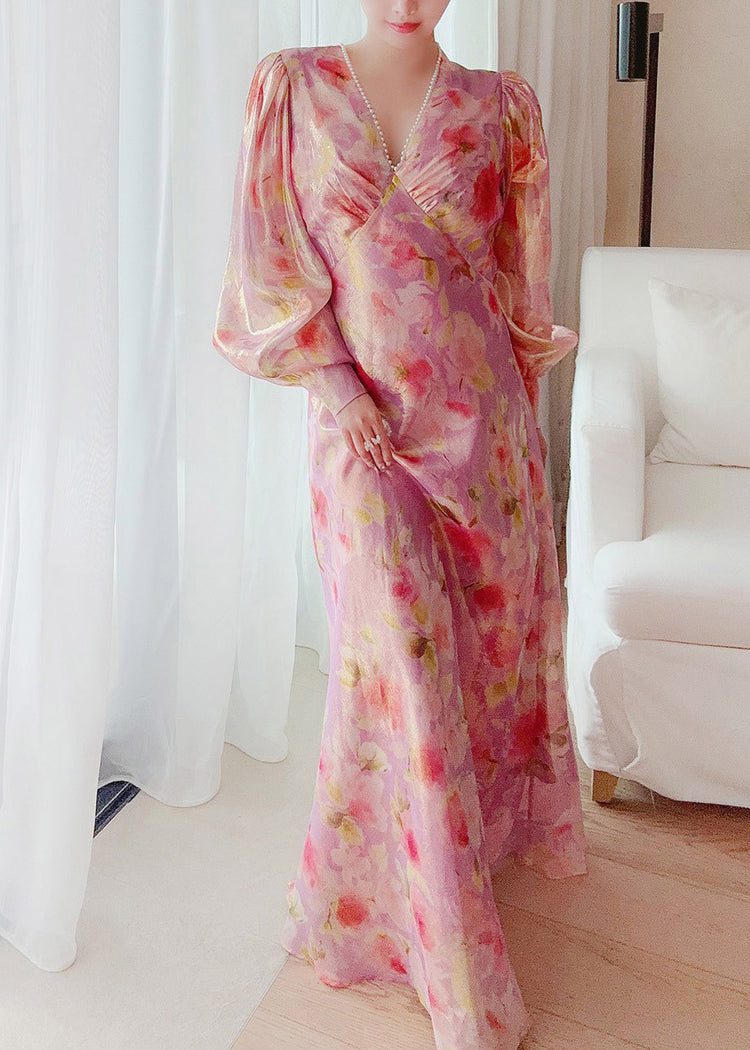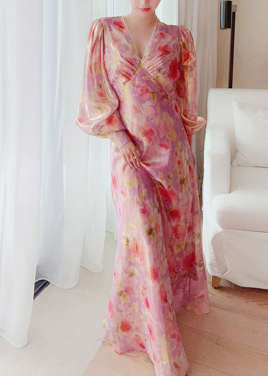Handmade V Neck Print Nail bead Silk Maxi Dresses Lantern Sleeve