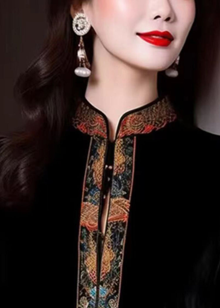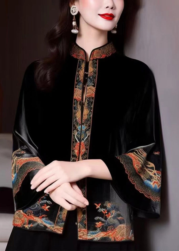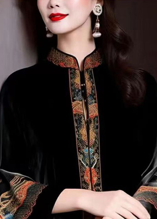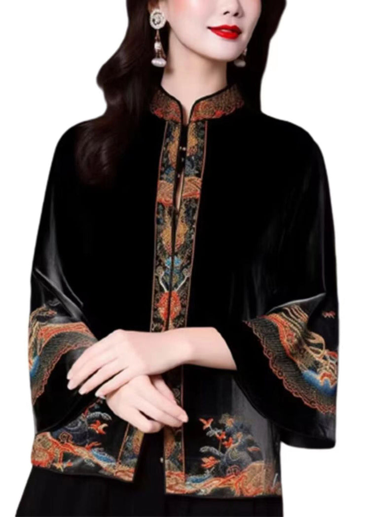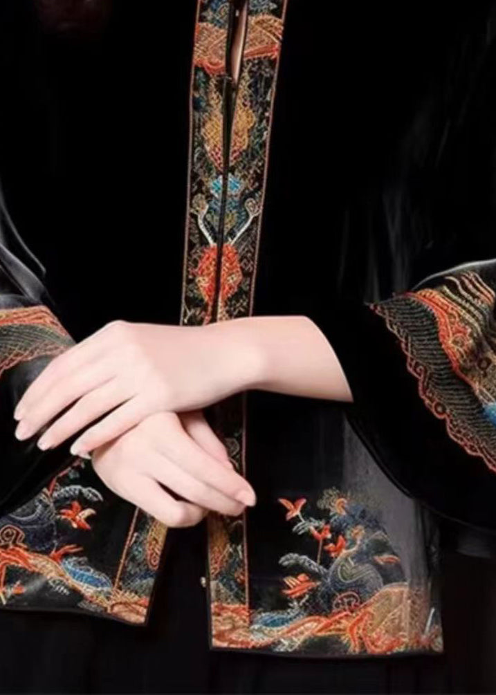 Loose Black Stand Collar Embroideried Silk Velour Coats Flare Sleeve