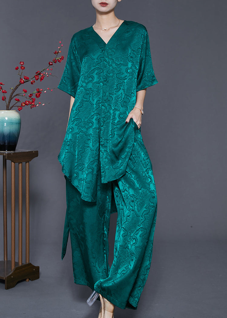 Peacock Green Print Silk Two Piece Set Outfits Asymmetrical Summer