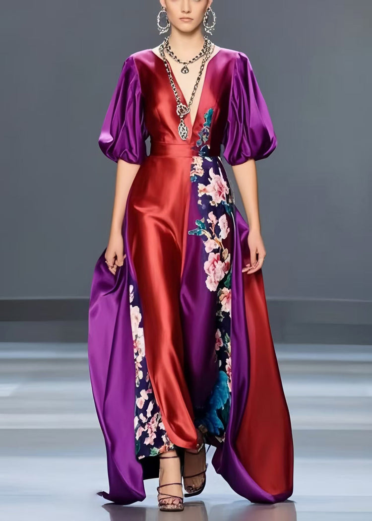 Polychrome Floral Print Silk Maxi Dresses Asymmetrical Design Lantern Sleeve