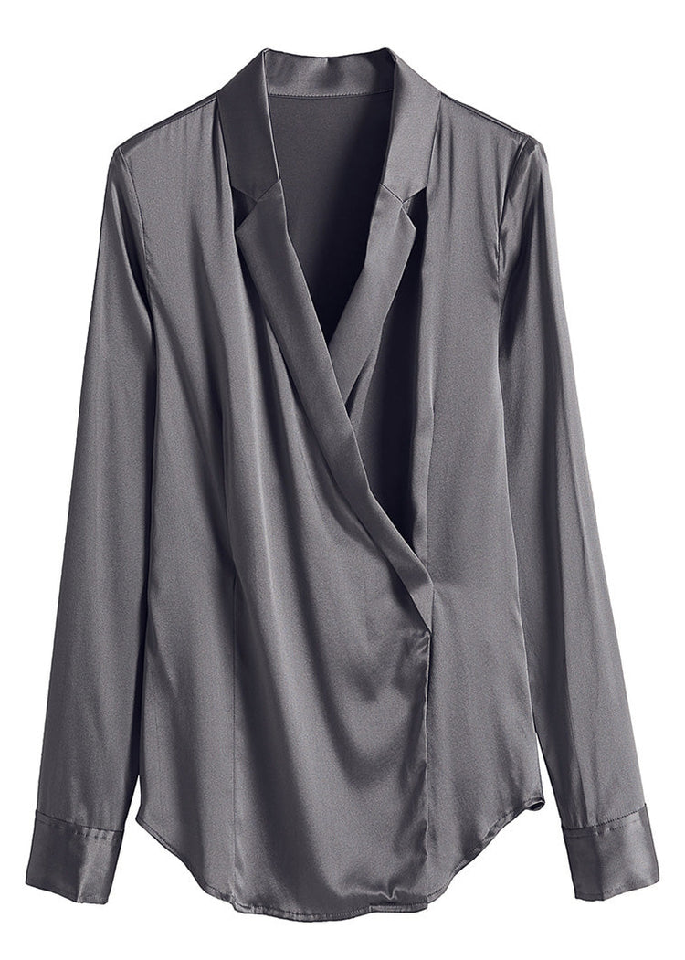 Slim Fit Grey V Neck Button Solid Silk Shirt Long Sleeve