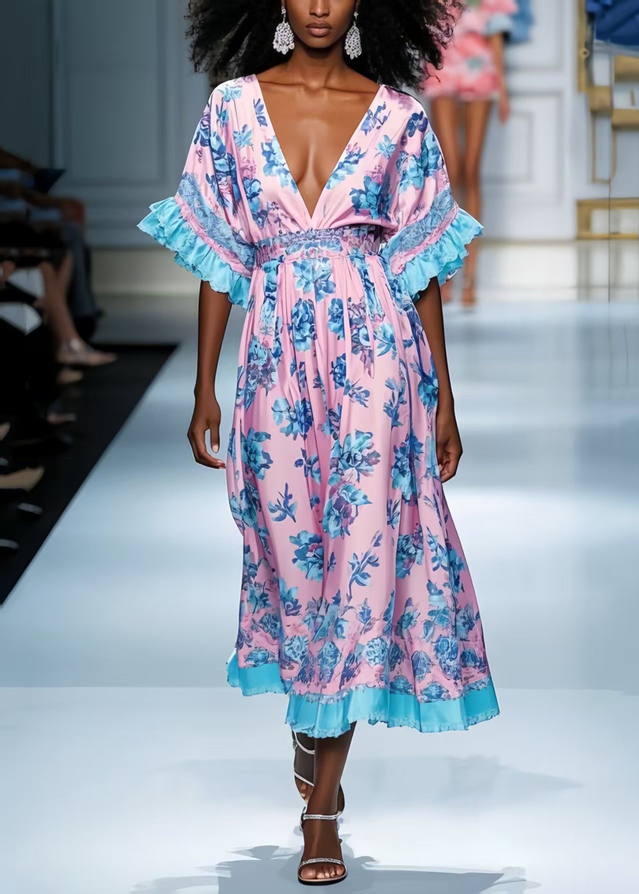 Style Pink Deep-V Neck Print Silk Dress Summer