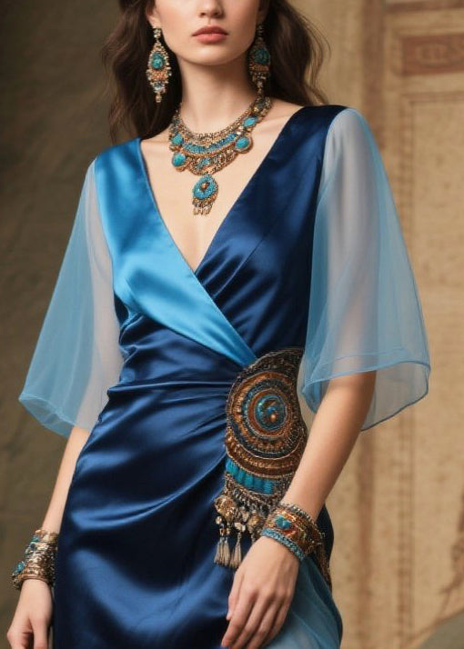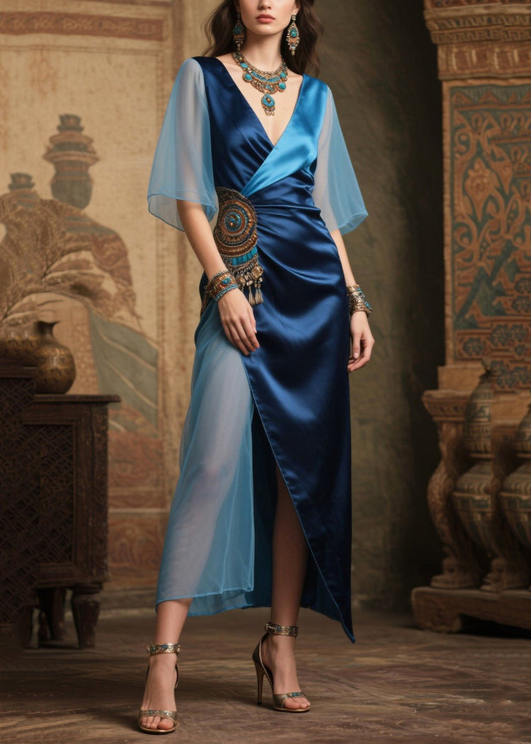 Stylish Navy V Neck Patchwork Side Open Silk Tea Dresses Summer