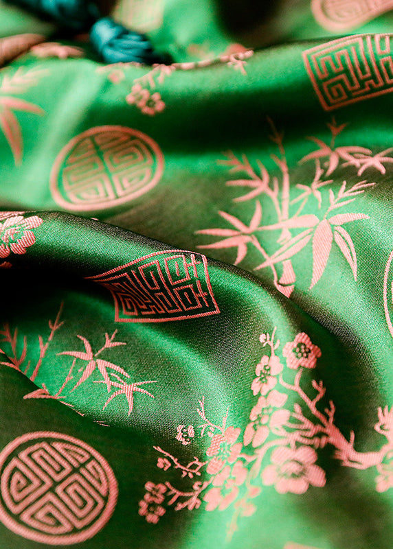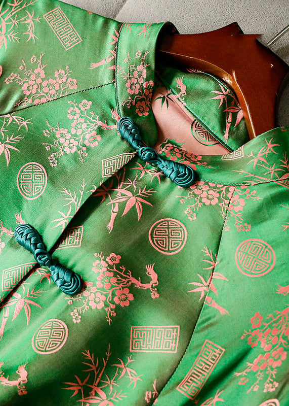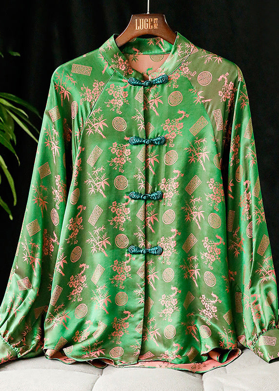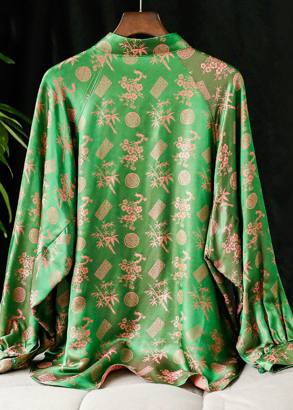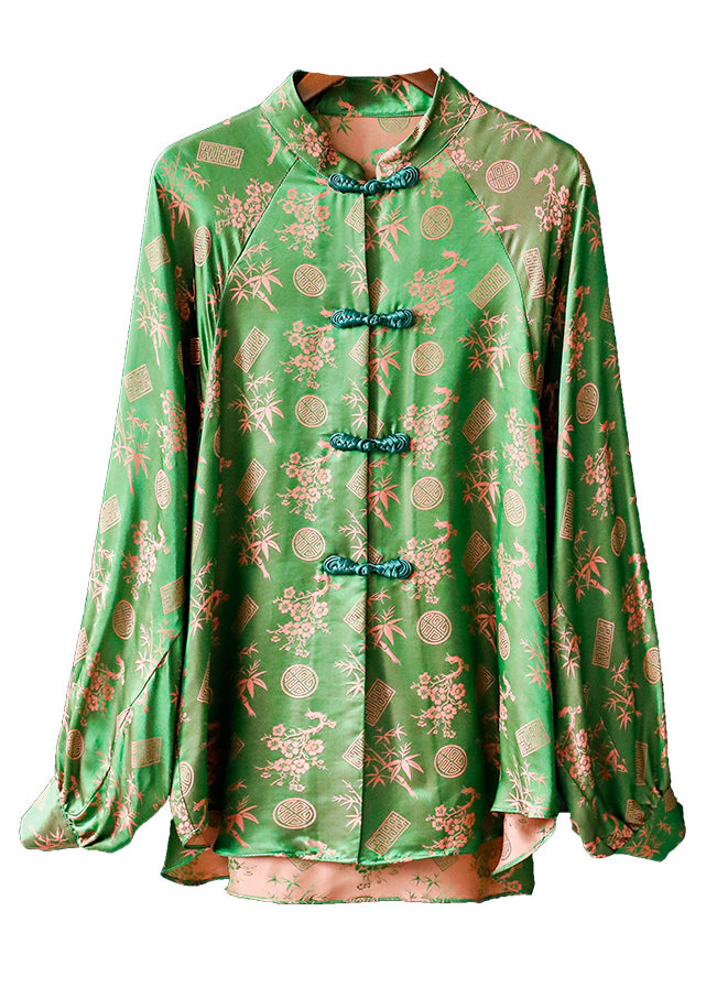 Women Green Stand Collar Button Print Silk Shirt Tops Long sleeve