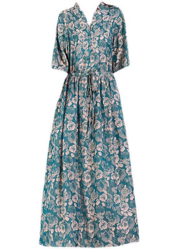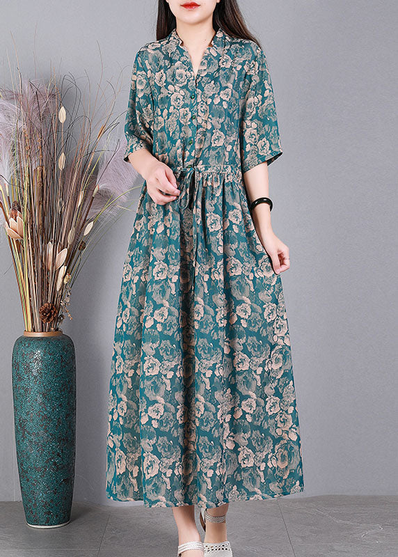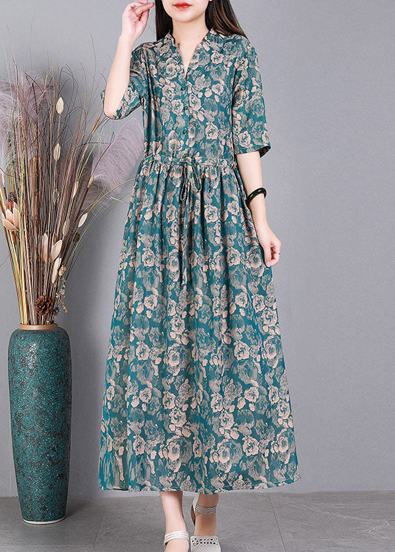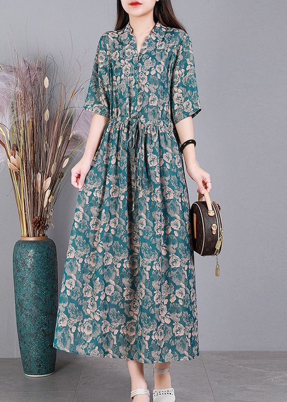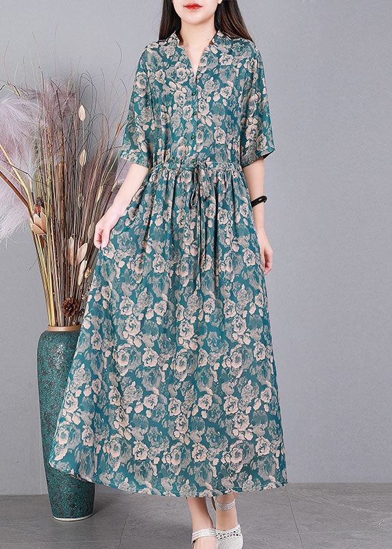 Women Green V Neck Drawstring Print Silk Long Dress Short Sleeve