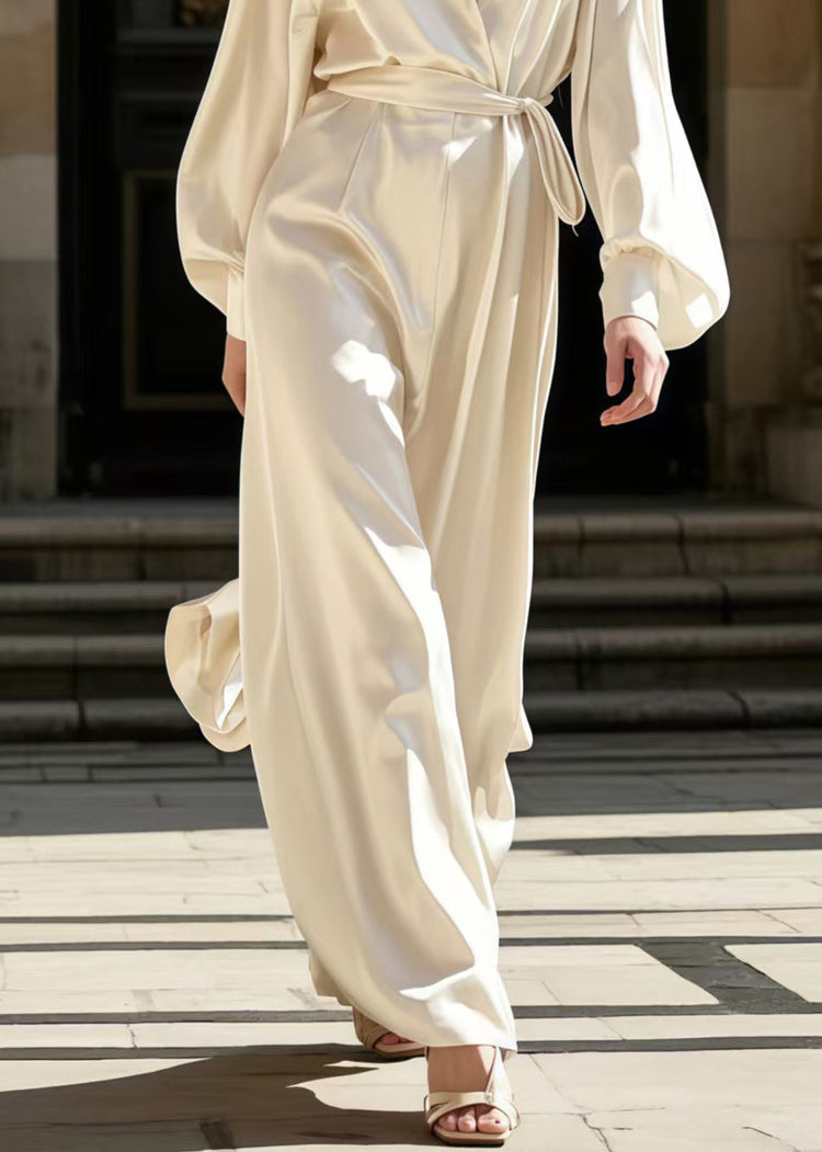 Women Milk White Notched Tie Waist Silk Overalls Jumpsuit Spring