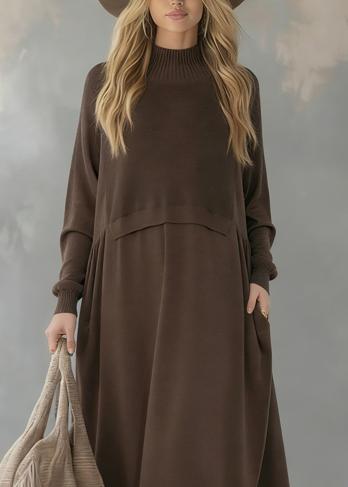 Bohemian Chocolate Turtle Neck Patchwork Solid Wool Knit Sweater Dress Long Sleeve