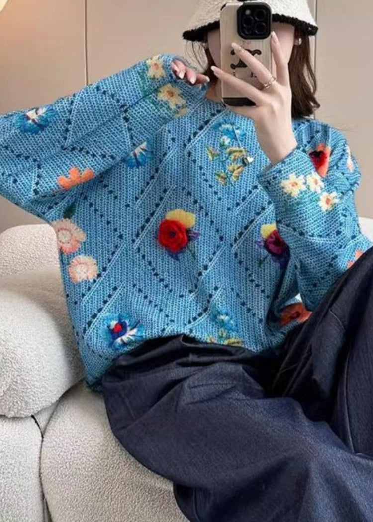 Beautiful Blue Floral Hollow Out Cotton Knit Sweater Tops Batwing Sleeve
