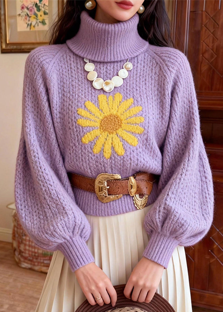 Stylish Purple Hign Neck Jacquard Knit Short Sweater Winter