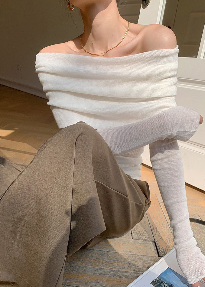 French Red Cold Shoulder Silm Fit Knit Tops Spring