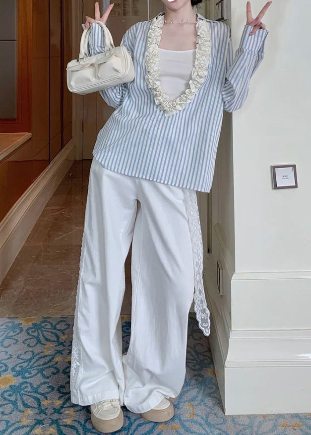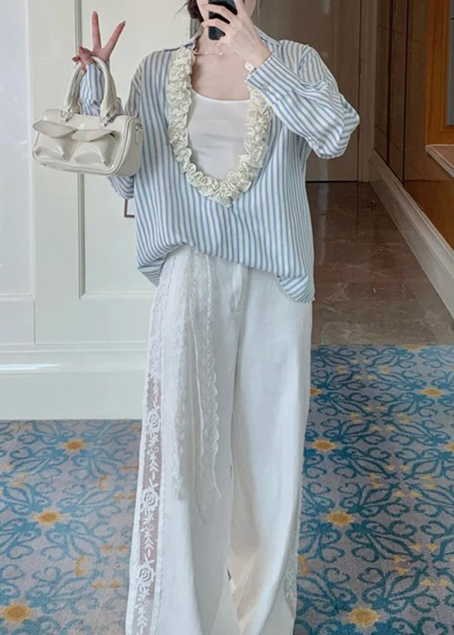 Fitted Blue Striped Hollow Out Embroidered Cotton Two Pieces Set Summer