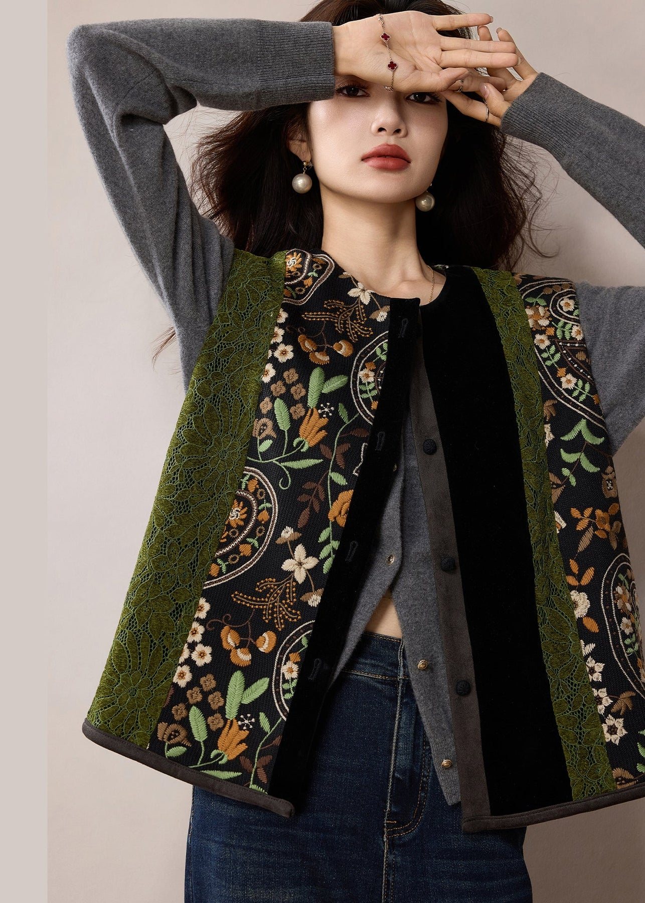 New Green Embroideried Patchwork Silk Velour Vest Sleeveless