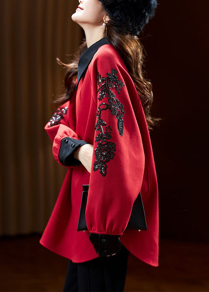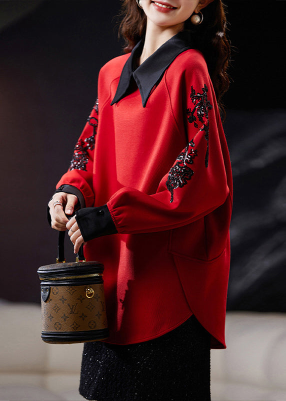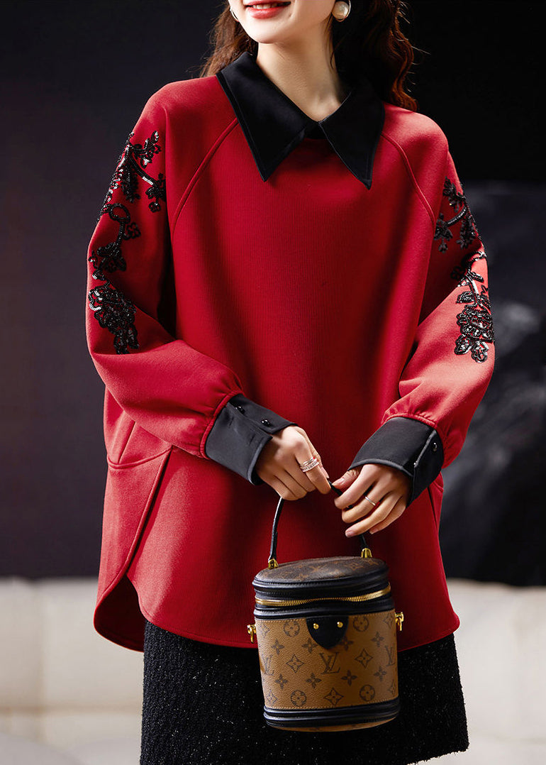 Beautiful Mulberry Peter Pan Collar Sequins Cotton Sweatshirt Spring