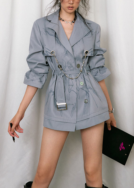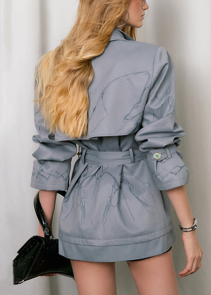 Blue Pockets Tie Waist Cotton Trench Coat Peter Pan Collar