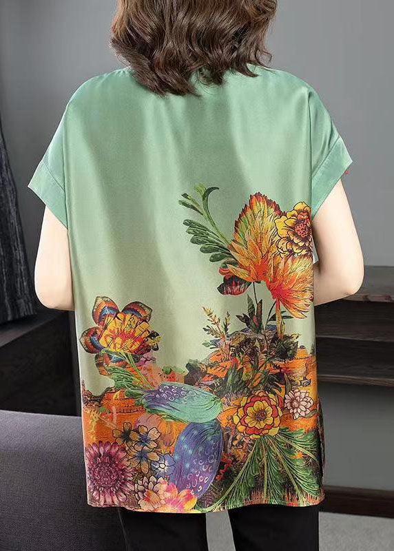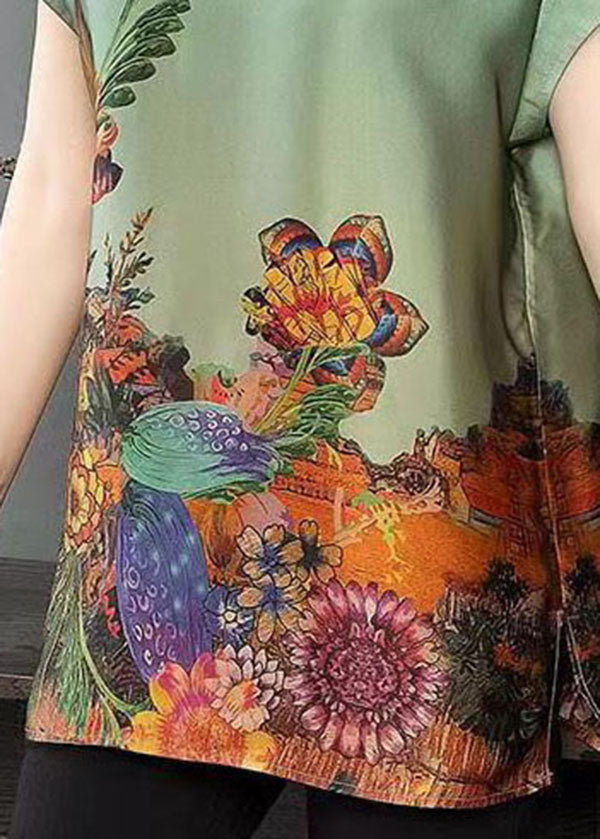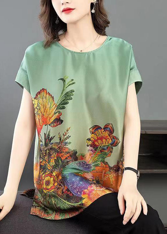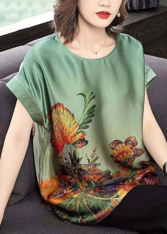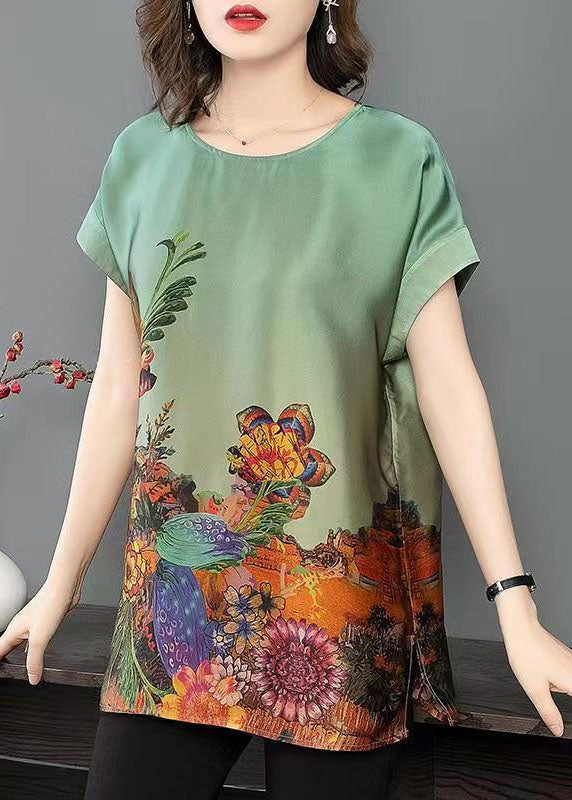 Bohemian Green O-Neck Side Open Print Silk Tanks Short Sleeve