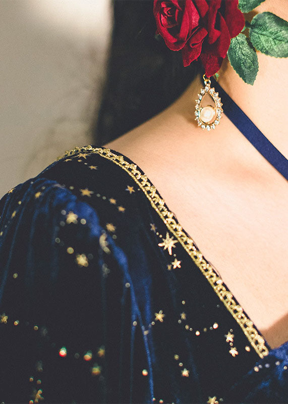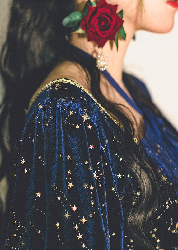 Bohemian Navy Square Collar Sequins Exra Large Hem Silk Velour Maxi Dresses Spring