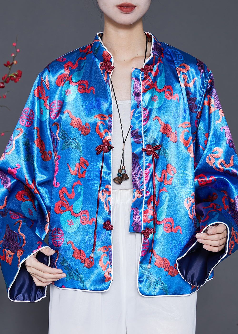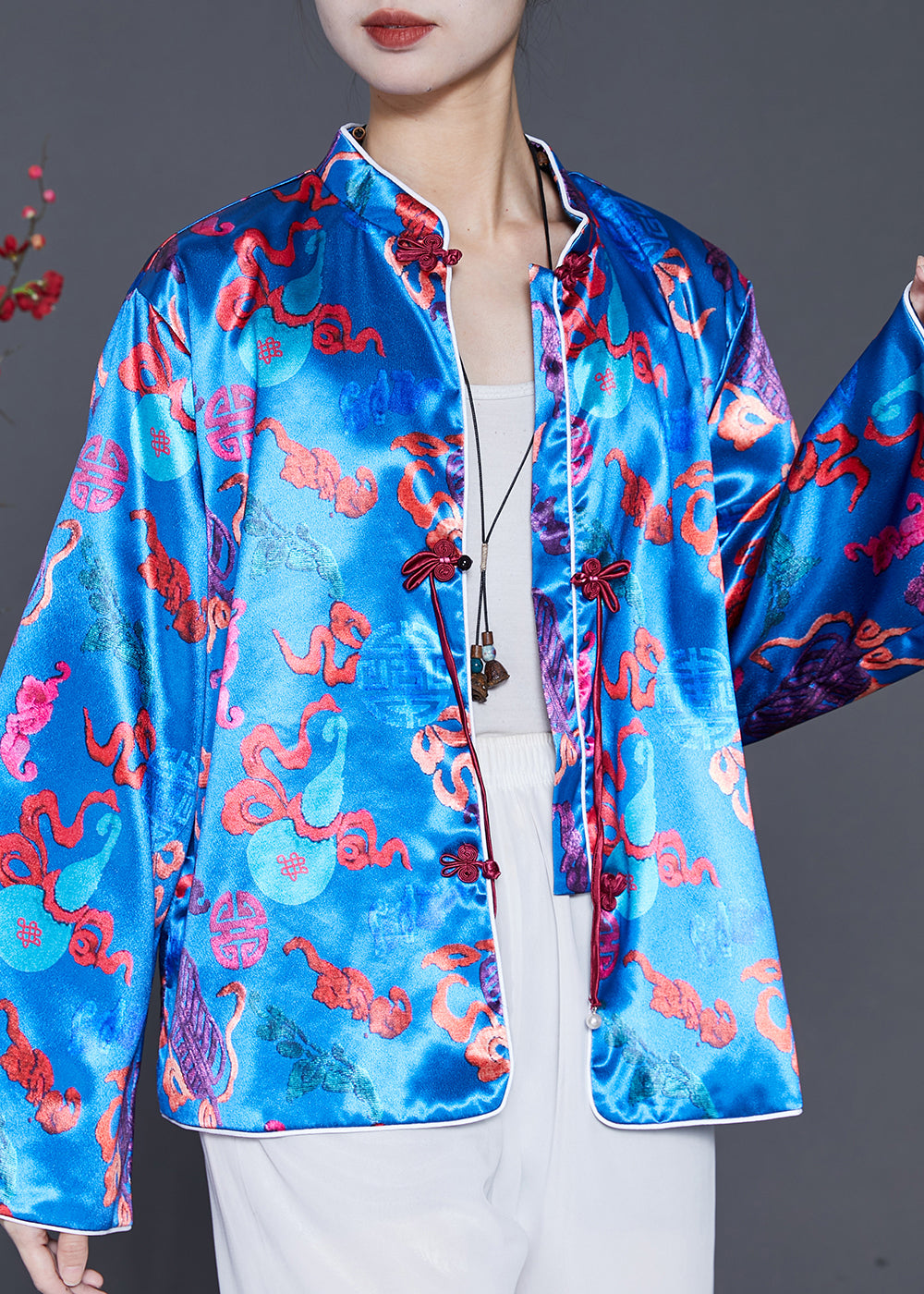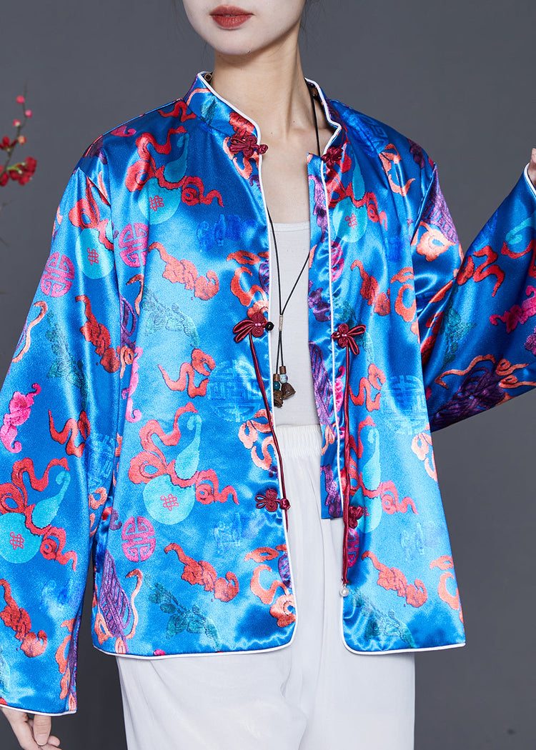 Boutique Blue Tasseled Jacquard Silk Coat Spring