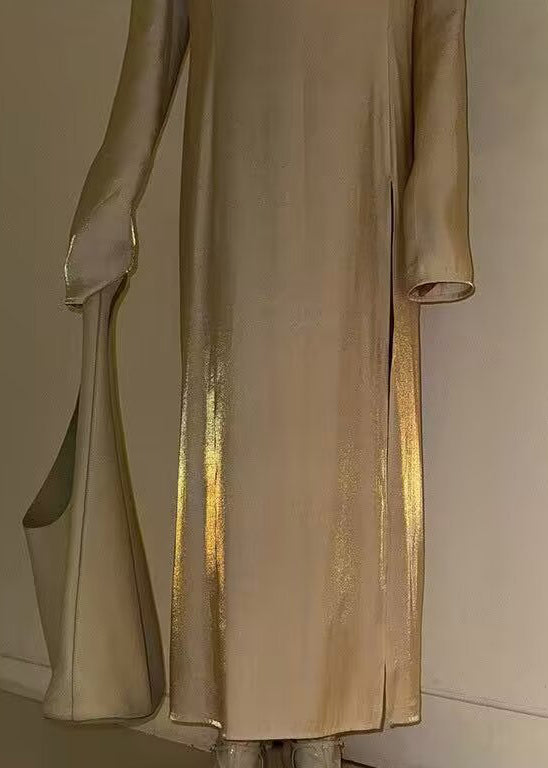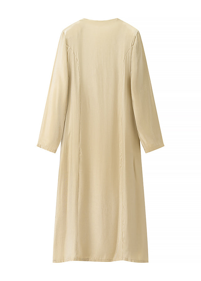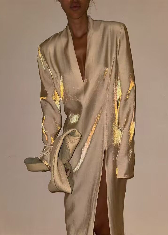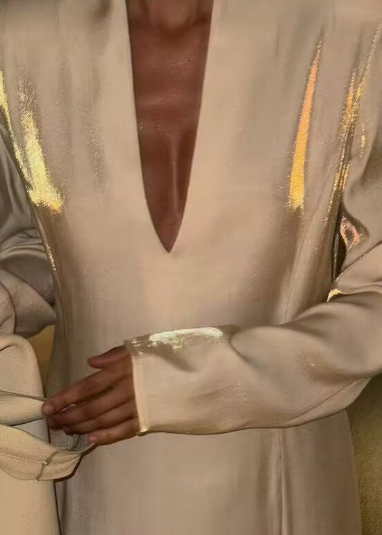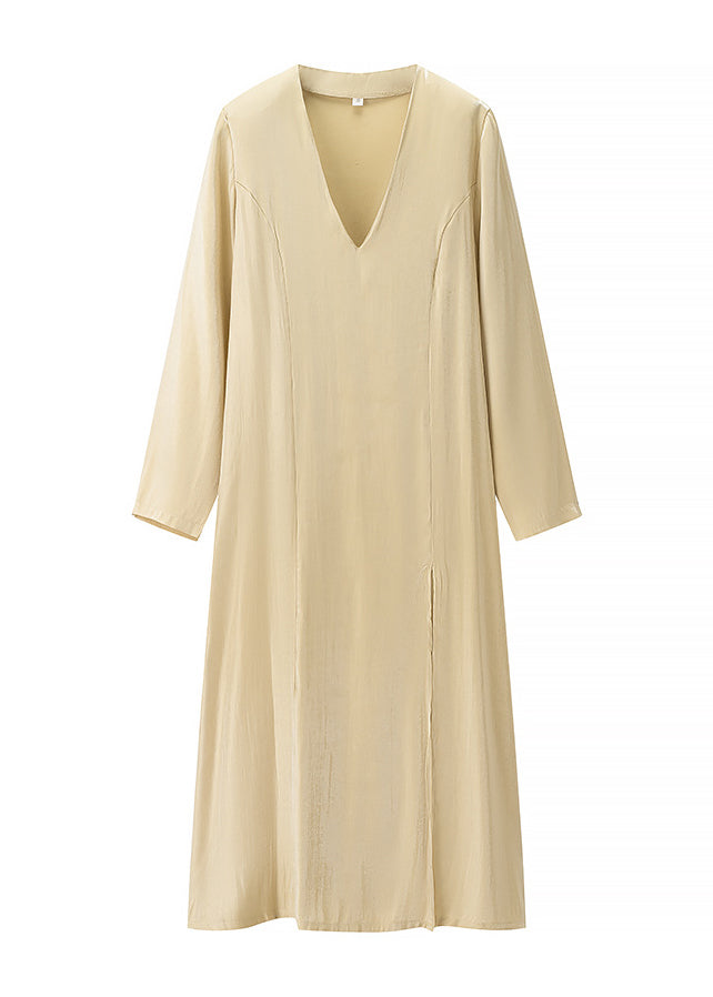 Classy Beige V Neck Side Open Silk Long Dress Spring
