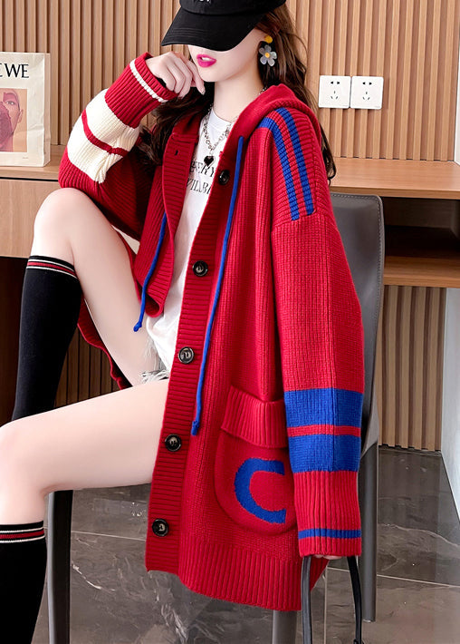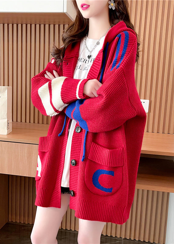Cozy Red Hooded Pockets Button Patchwork Knit Cardigans Coat Fall