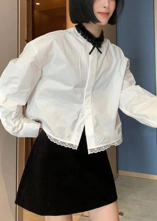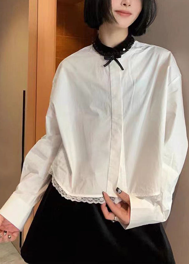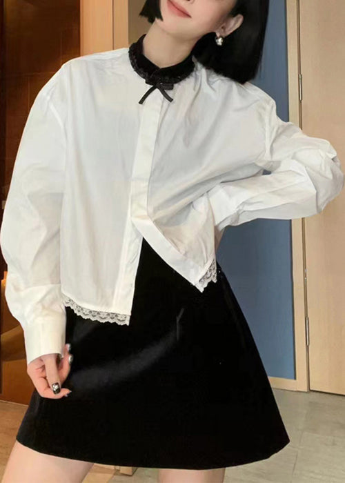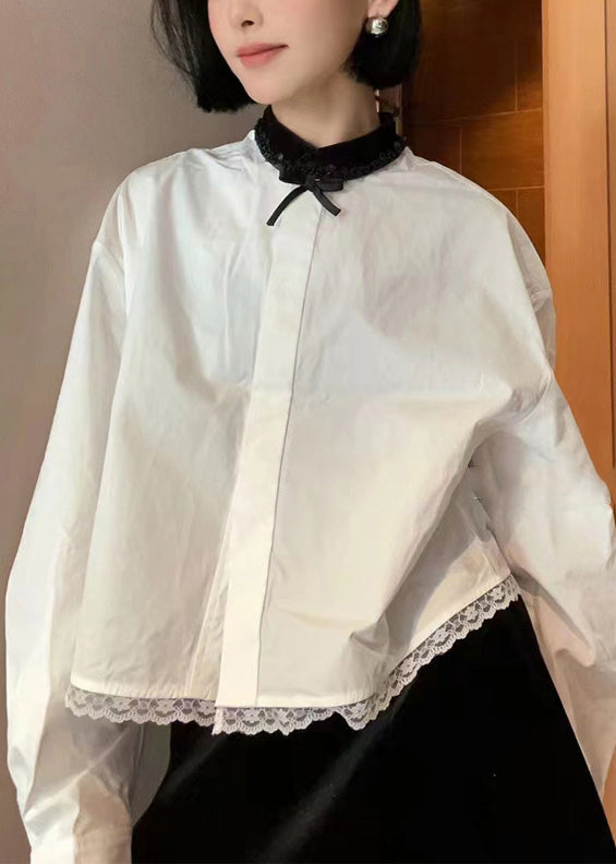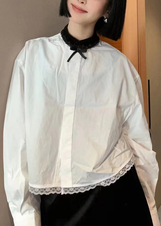 French White Solid Lace Patchwork Cotton Blouse Long Sleeve