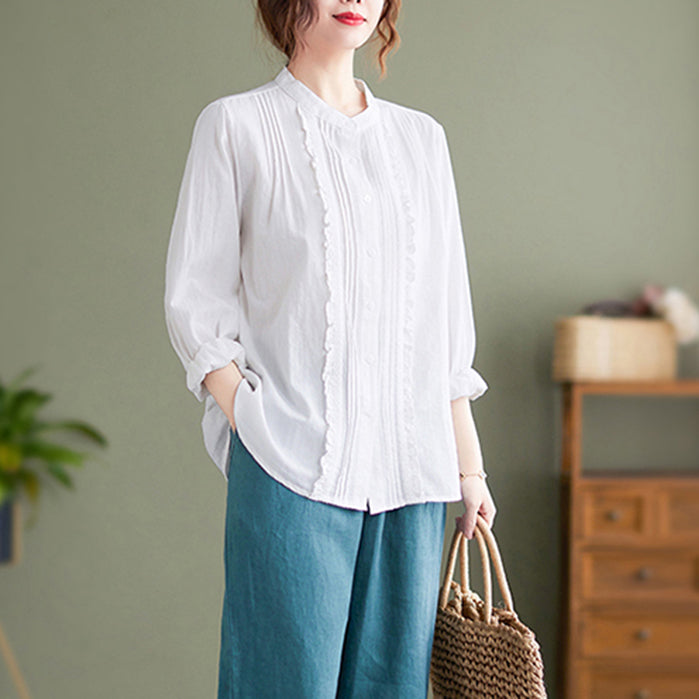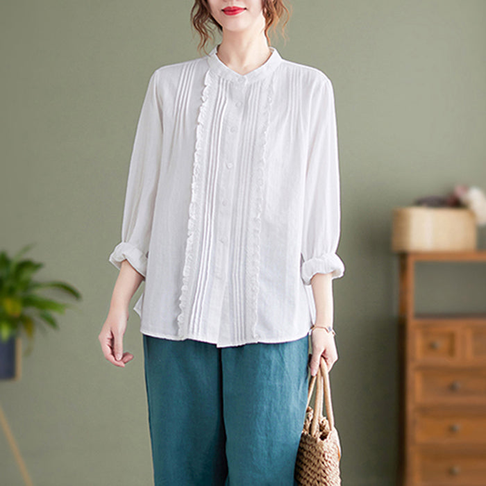 French White Stand Collar Button Ruffled Blouses Long Sleeve