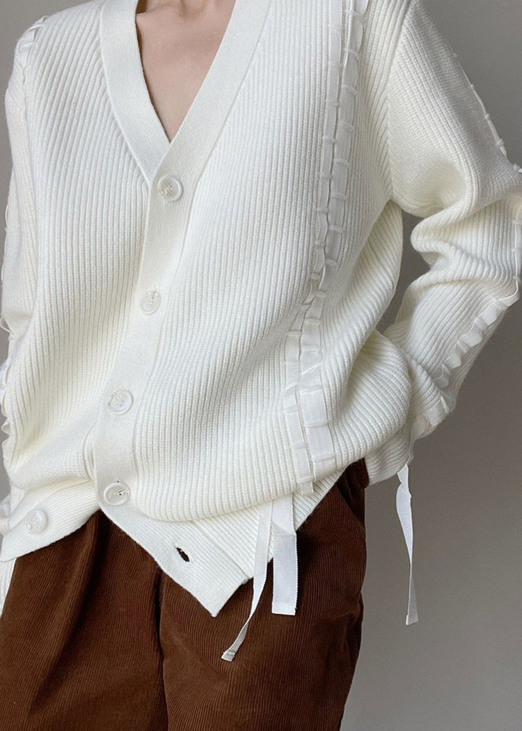 French White V Neck Button Knit Woolen Cardigans Spring