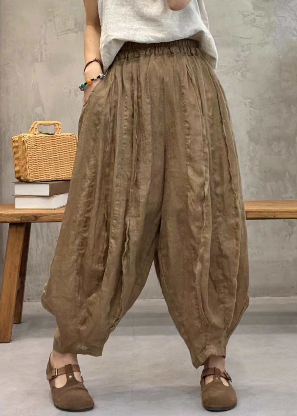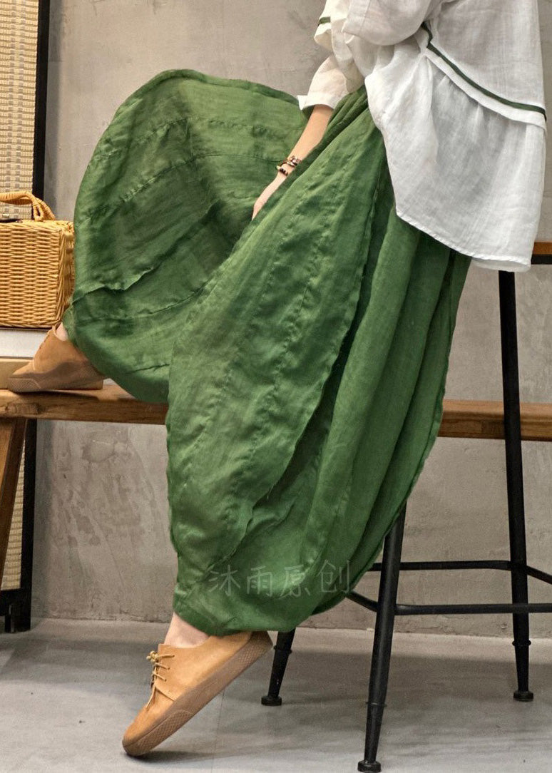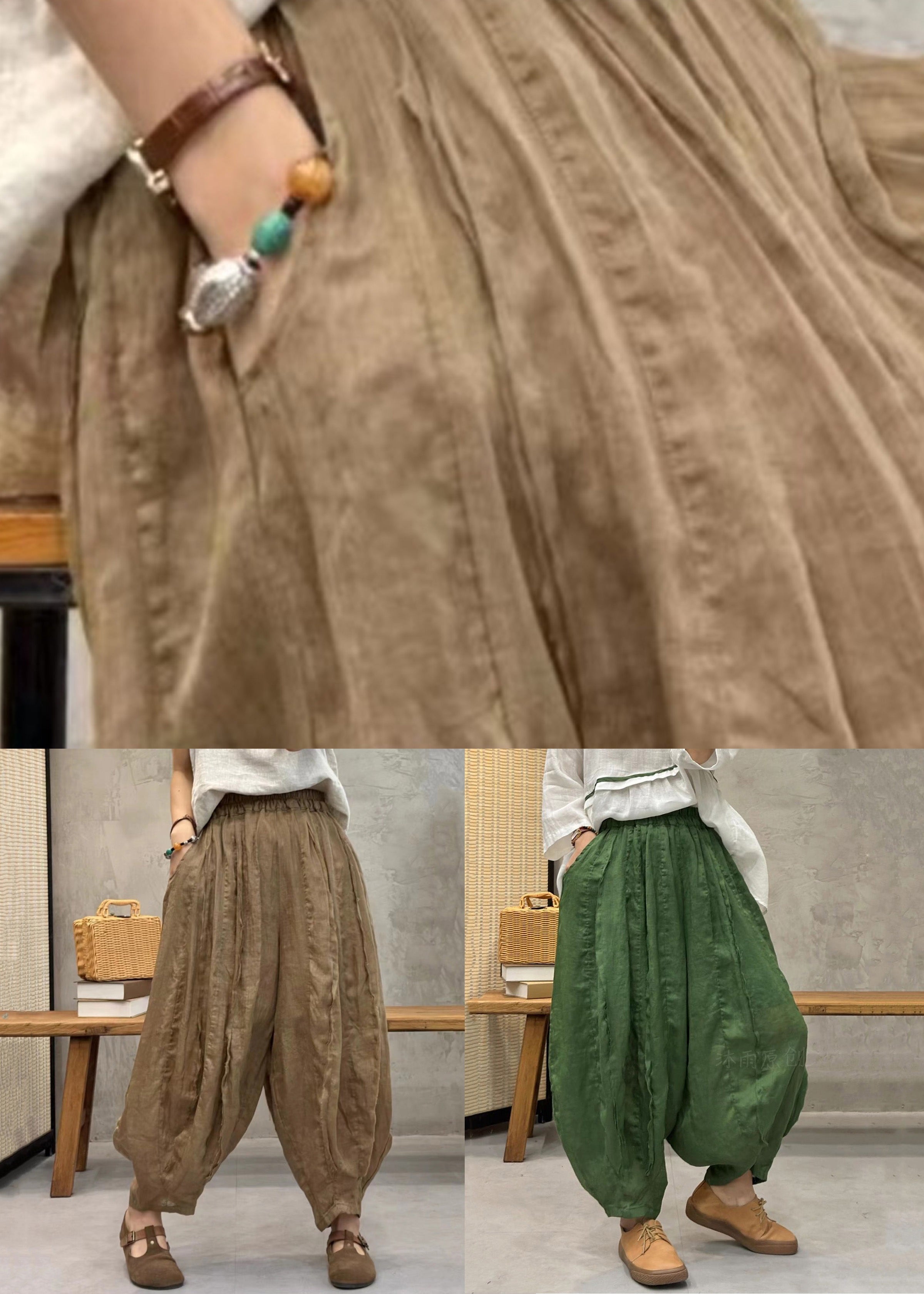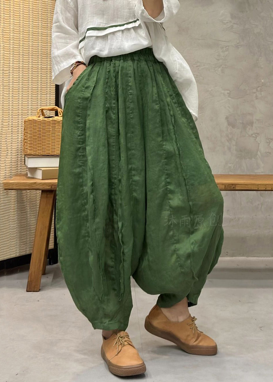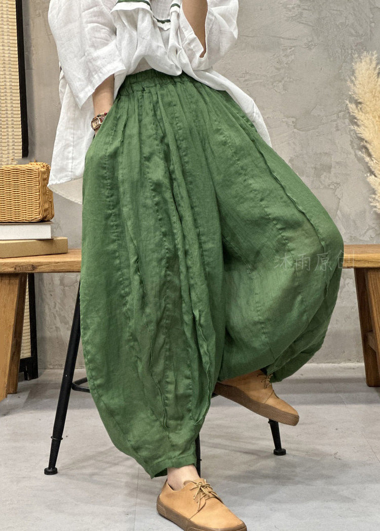 Green Solid Elastic Waist Thin Linen Crop Pants Pockets